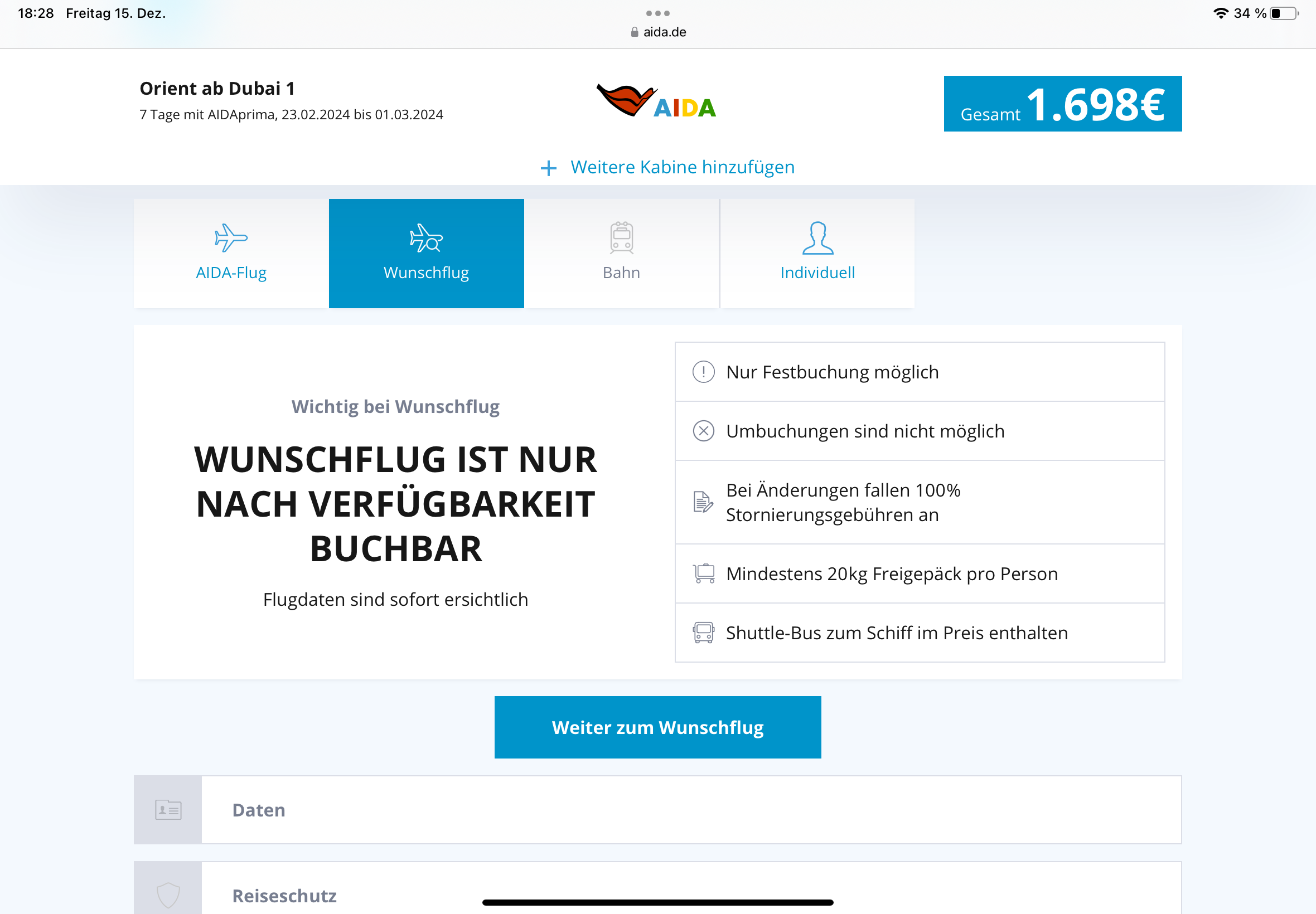 AIDA hat die Buchungsmaske überarbeitet, jetzt kann man direkt bei der Buchung Wunschflüge über einen extra Button buchen: