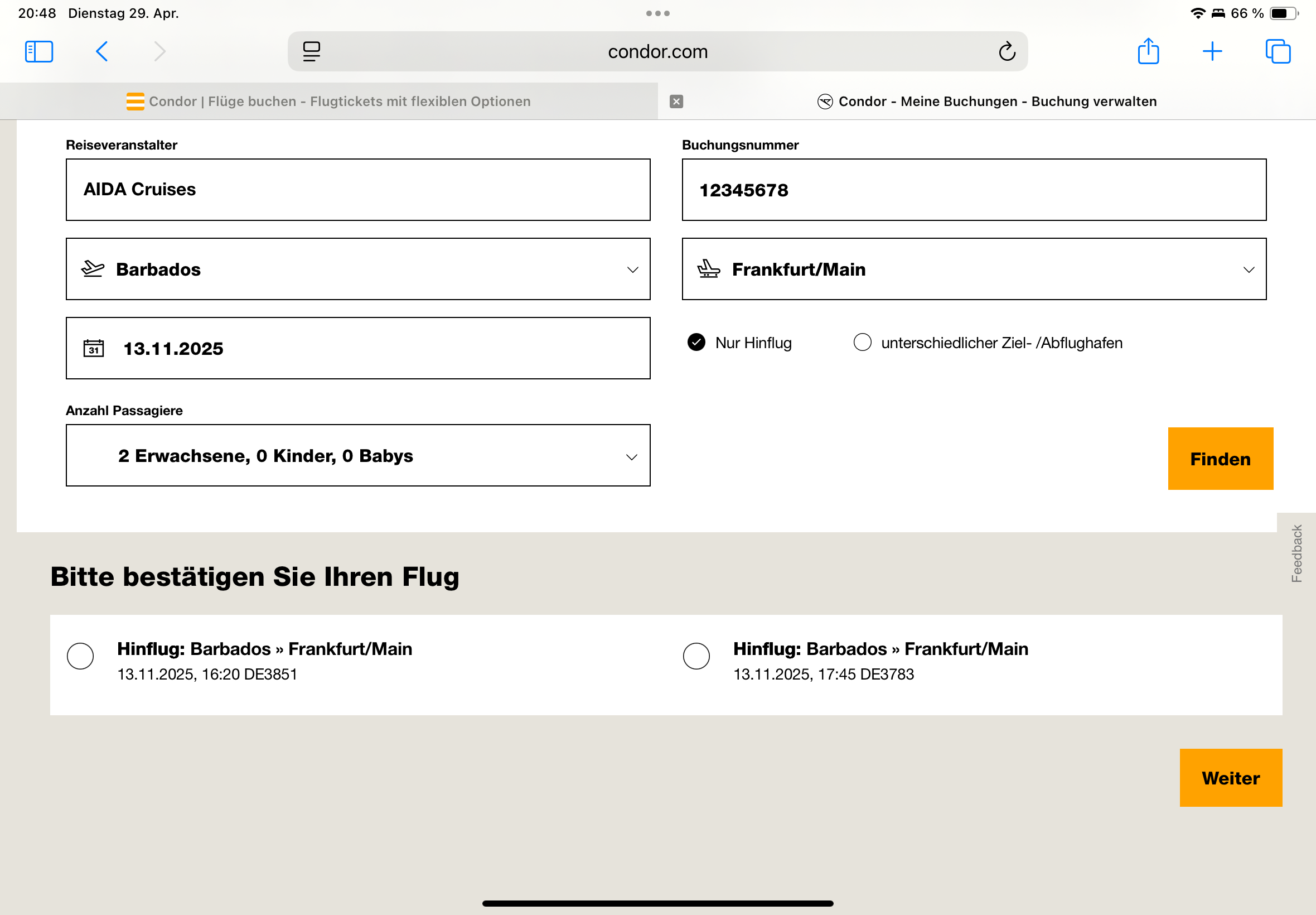 Denn bei Condor kann man sich mit jeder(!) Buchungsnummer auf jeden(!) Flug einbuchten und Sachen reservieren, es findet keine Abfrage statt, ob Ihr wirklich für diesen Flug gebucht seid!
