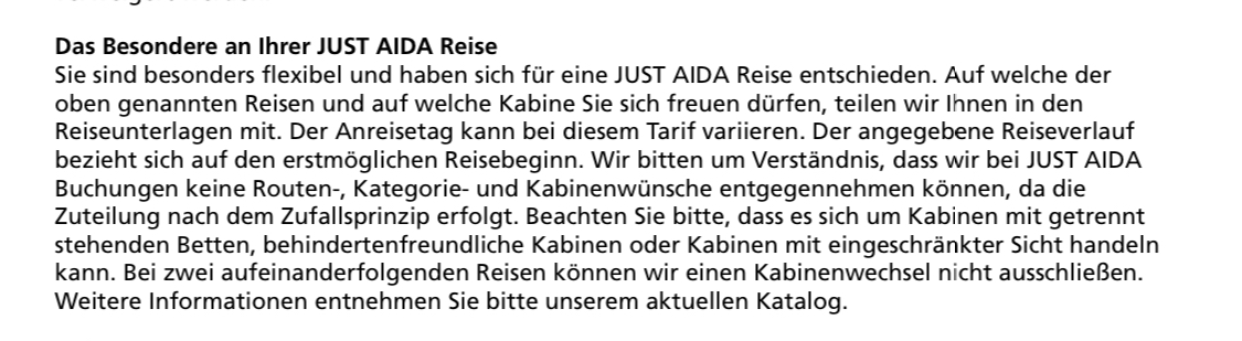 Okay, dass wusste ich nicht. Wir hatten bei unseren vorherigen Aida Reisen mit Außenkabine im Just Aida Tarif gebucht hatten und immer einen extra Hinweis bekommen, dass es vorkommen kann, dass man auch Kabinen mit Sichtbehinderungen bekommen kann. Aber vielleicht war das nur wegen Just Aida oder weil es schon ein paar Jahre her ist. Habe es noch mal aus unseren Reiseunterlagen rausgesucht.