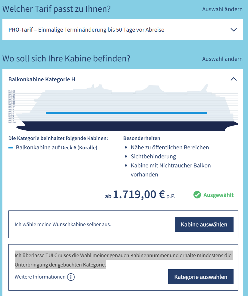 Und wenn ich sagen wir mal eine Außenkabine im Pro Tarif buchen und die Auswahl der genauen Kabine der Reederei überlassen möchte, dann könnte es am Ende dann eine Balkonkabine werden, mit der Gefahr dann die schlechtmöglichste zu bekommen, richtig?