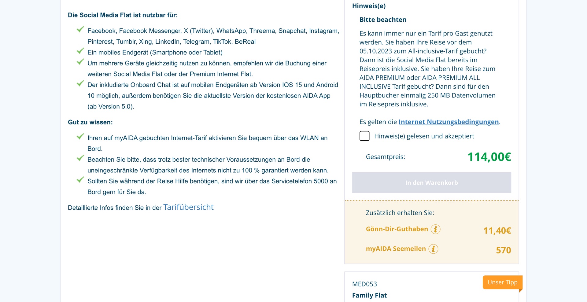 Ich habe mich heute mal an das AIDA Social Media Team über Messenger gewendet und gefragt, ob das Gourmet-Frühstück überhaupt noch ab dem 01.11.2024 vorab zu buchen ist.