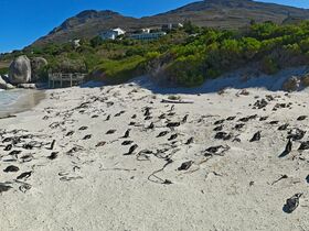 Angekommen am Boulders Beach bei den Pinguinen. Auch hier ging der Wind sehr heftig, aber das trübte unsere Stimmung nicht.