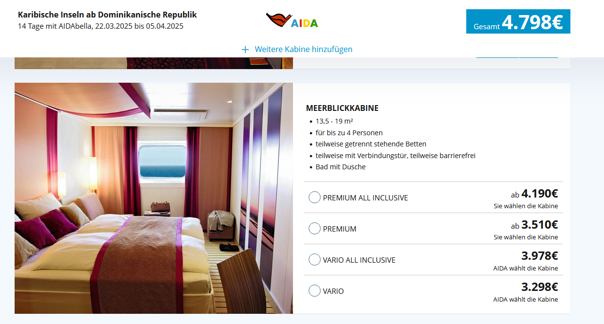 2 Balkonkabinen (2 Erwachsene + 1 Erwachsene + 1 Jugendliche) Vario all in. Es gab pro Person 150 BGH dazu.