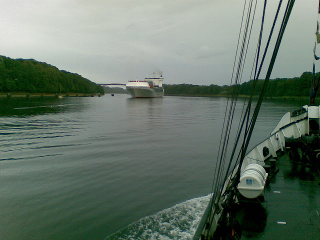 Begegnungen im Kanal. Ein Containerzulieferer der Klasse Fünf. Nur die Bussard, als Klasse Eins Schiff darf den Riesen passieren, die andern müssen warten. An den Engpassstellen des Kanals sieht das Ding wie eine Mauer aus. Im Hintergrund die Levensauer Hochbücke, die im Zuge der Kanalerweiterung weichen muss.