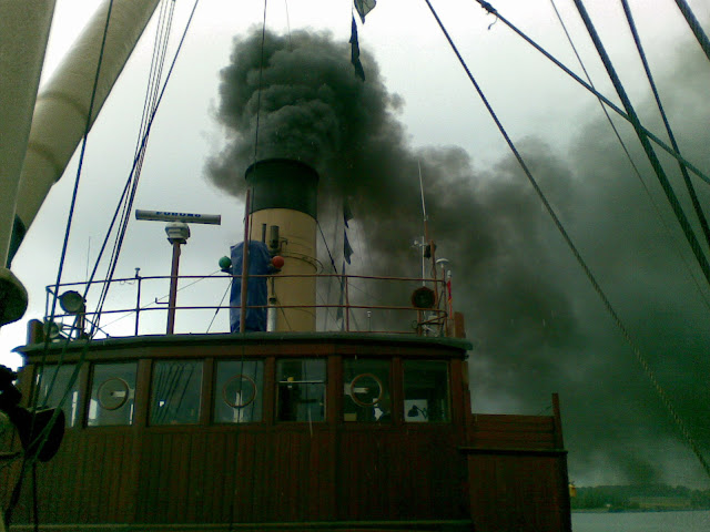 ...nach dem Auslaufen,.konnte man vor lauter Schwarzqualm auf der Kieler Förde nicht viel vom Dampfer erkennen und die Personen an Oberdeck waren sicherlich auch nicht zu beneiden