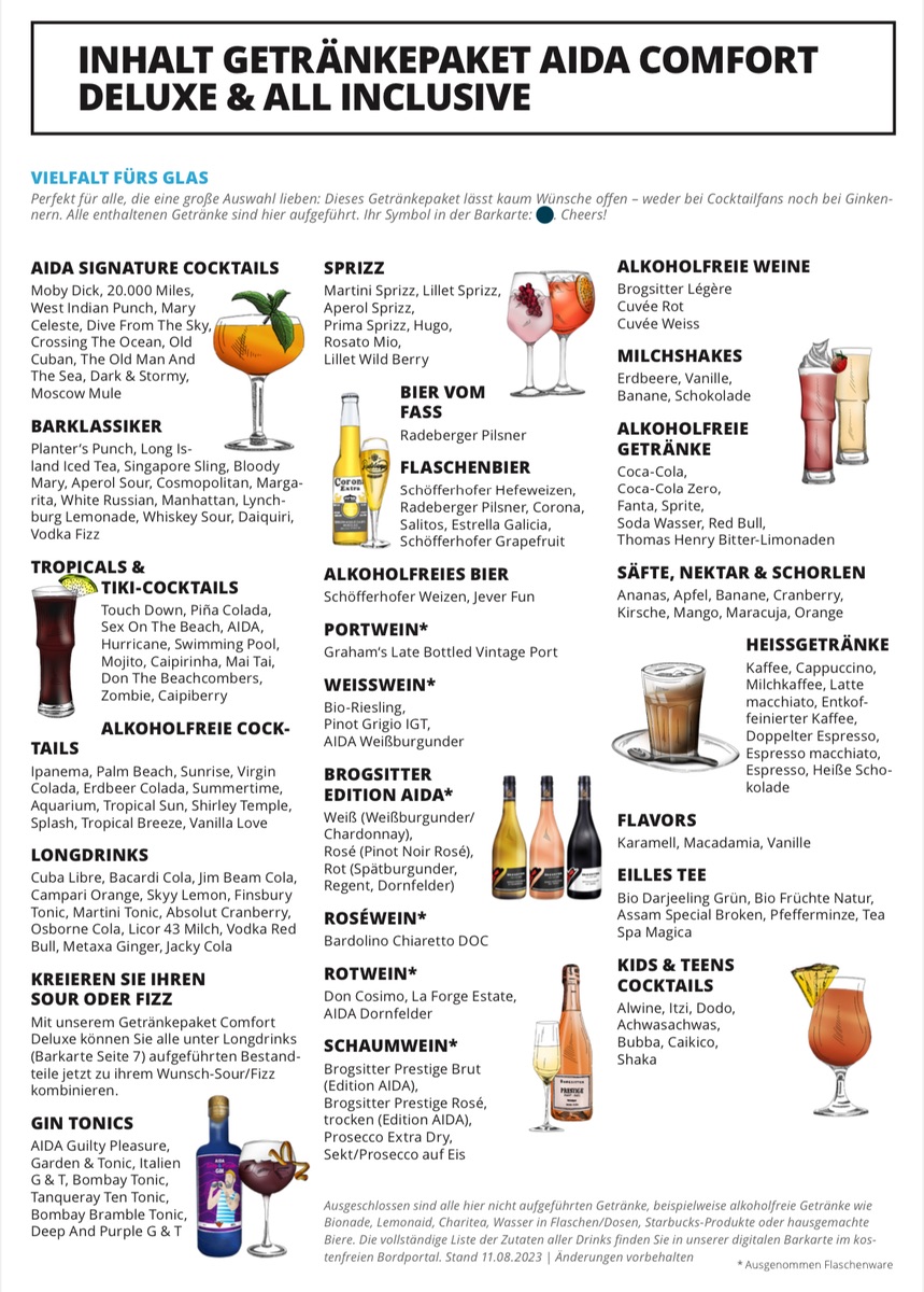 Von der Homepage hatte ich mir die aktuelle Übersicht über das All In bzw. Comfort Deluxe Getränkepaket ohne Froozies, mit alkoholfreiem Wein schon gespeichert. Heute kam der MyAidaReiseplan für unsere in zwei Tagen beginnende Reise mit anhängender Übersicht der alten Karte inklusive Froozies, ohne alkoholfreien Wein
