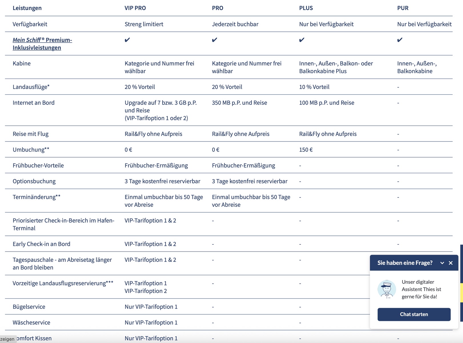 Übrigens nur der Vollständigkeit halber (weil das Argument ja schon kam) hier eine Übersicht der Mein Schiff - Tarife. Zusätzlich sind in bestimmten Tarifen VIP 1 und VIP 2 als Option buchbar. Also viel einfacher. 😉