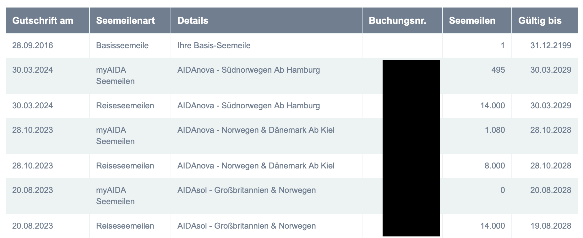 Ich habe gerade bei mir nachgesehen: Das sind tatsächlich die Seemeilen für myAIDA-Buchungen, die unter "Zukünftige Reisen" im Club angezeigt werden. Sieht man auch am Verfalldatum der Meilen - 6 Jahre wären etwas lang.