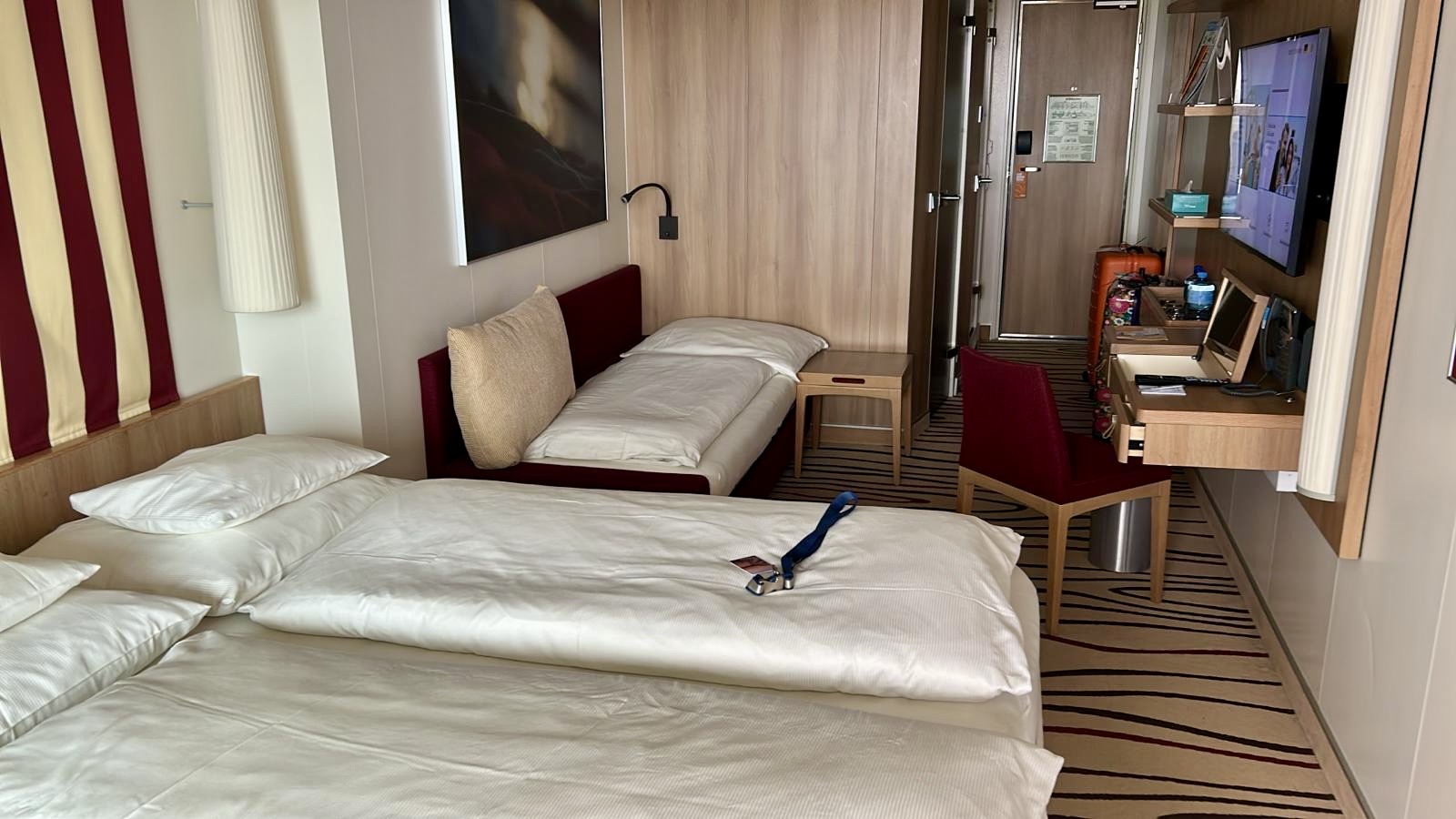 Am Flughafen Porto dann pures Chaos: Niemand da, der sagt, wo's langgeht - wir sind dann einfach hinterher gelaufen in der Hoffnung, dass der Erste richtig läuft. Ewiges Anstehen an den Transferbussen, wobei wir noch Glück hatten, dass überhaupt welche da waren. Von Mitreisenden aus früheren Flügen haben wir gehört, dass bei ihrer Ankunft weder ein Ansprechpartner, noch ein Bus mit entsprechender Beschriftung zu sehen war und sie sich total verloren vorkamen. Aber letztlich haben es dann doch alle an Bord geschafft, wobei die frühere Ankunft teilweise bis zu 3 Stunden Wartezeit beim Check-in eingebracht hat. Bei uns ging das dann doch recht flott und so waren wir gegen 20:00 Uhr Ortszeit (= zu Hause 21:00 Uhr) endlich auf der Kabine....