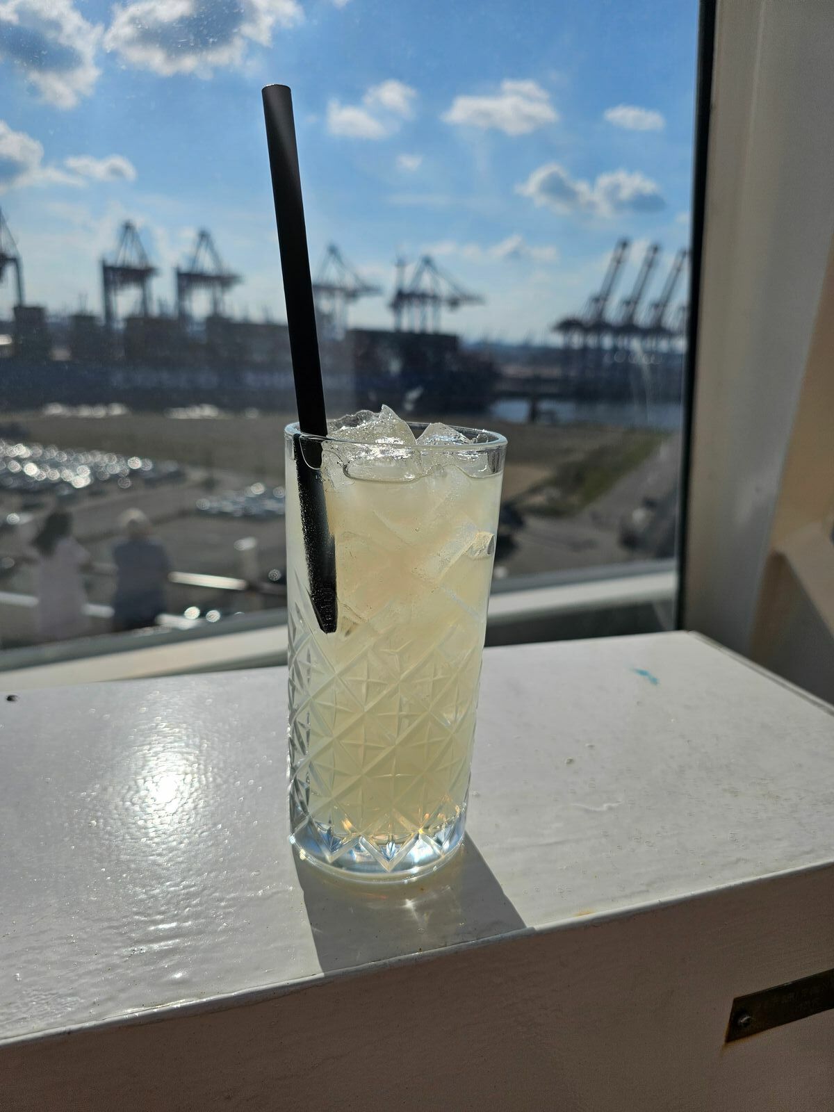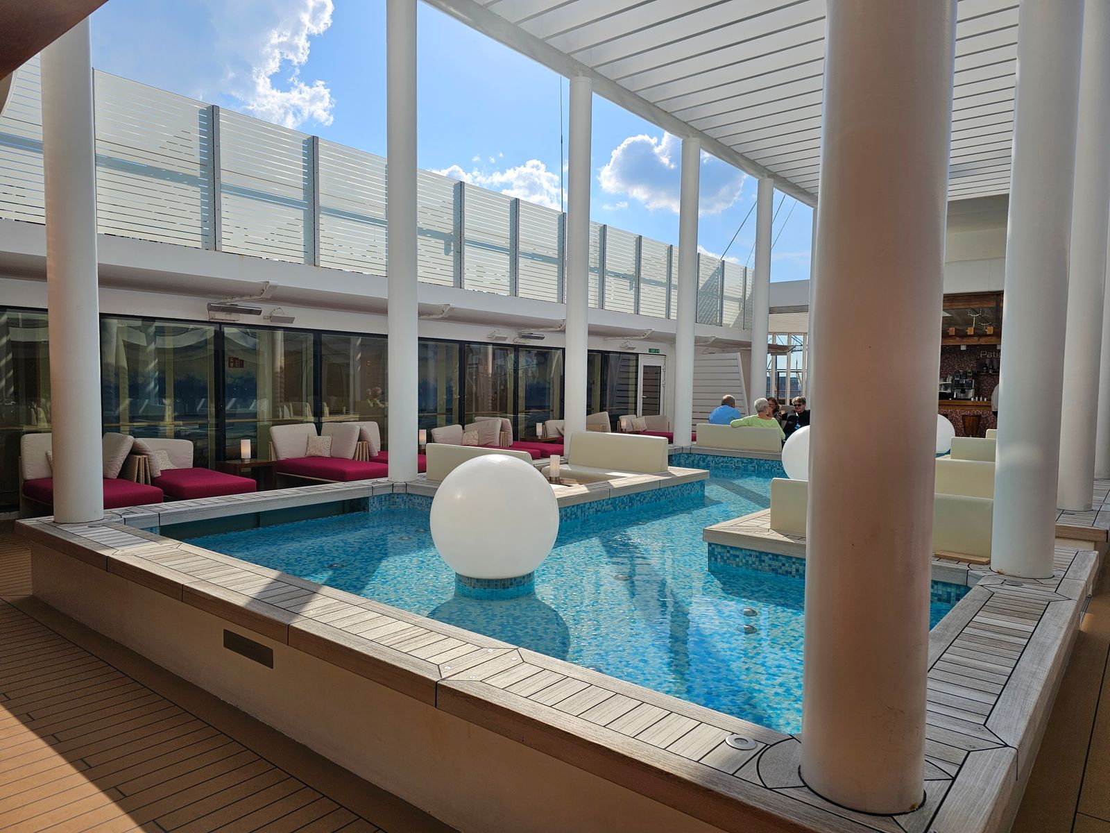 Hallo nochmal von Bord. Gleich wird abgelegt. Ich befinde mich aktuell auf dem Patio Deck und habe eine super Aussicht zum Auslaufen.