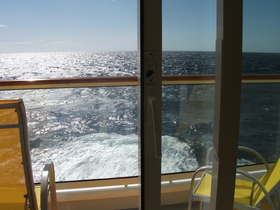 Das ist eine von den Kabinen, bei denen der Balkon größer ist. Auf der einen Seite grenzt er direkt an die Rettungsboote.