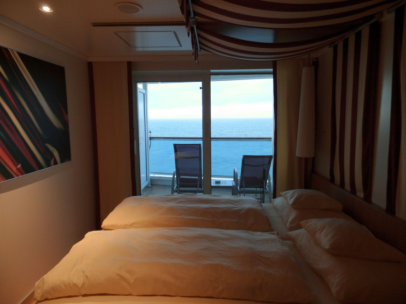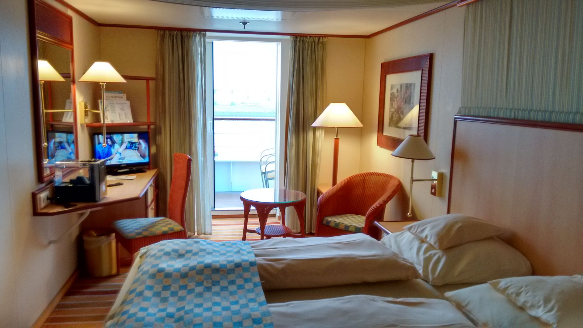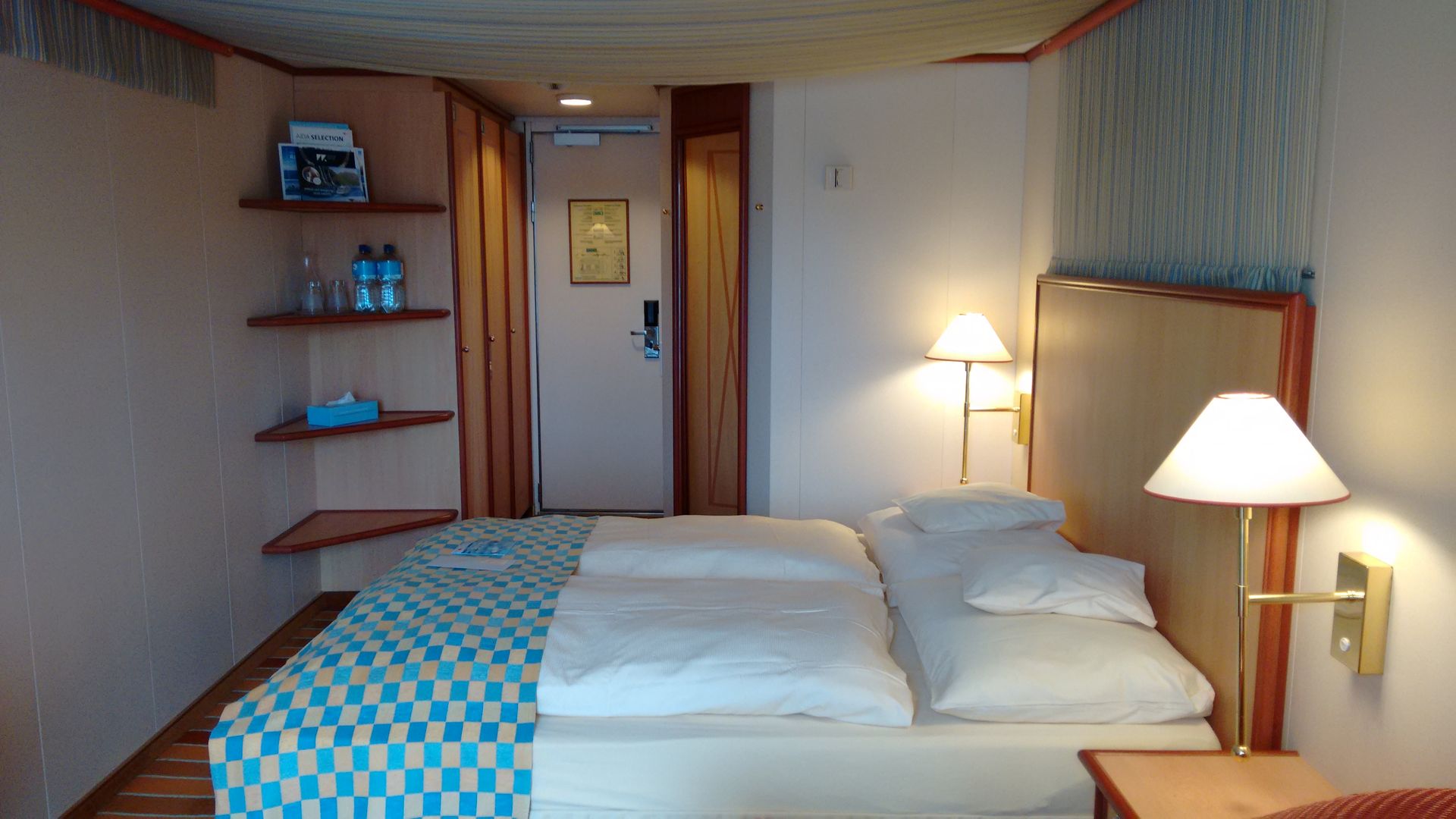 Mehr Fotos habe ich nicht gemacht. Irgendwie sehen die Balkonkabinen auf den „Melitta“-Schiffen doch ähnlich bis gleich aus. Aber vielleicht hilft dieses Bild trotzdem. Es wird manchmal gefragt, wie genau die Betten stehen.