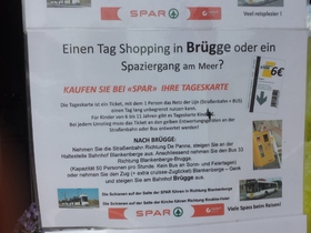 Aus meiner Erinnerung vom letzten Jahr: nach rechts, Richtung Zeebrügge gehen. Da kommt ein Sparladen. Dort kann man für 6 €? Tickets kaufen und es ist geschreiben, wie man hinkommt.