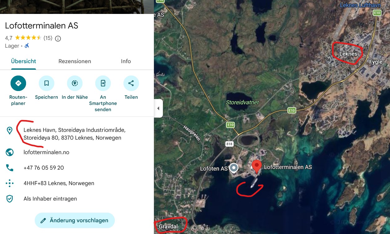 Um sicher zu gehen, dass ich nicht gerade vollkommen falsch unterwegs bin: Ich habe einmal eine Karte angehangen. Das ist ja hoffentlich der richtige Liegeplatz zwischen Gravdal und Leknes, wenn bei AIDA steht "Tag 15 - Leknes" ?