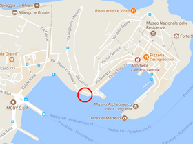Wir sind mit dem ersten Tenderboot (8.15 Uhr oder 8.30 Uhr) mitgefahren, da war an der Anlegestelle noch nichts los. Wir hatten einen Mietwagen in der Viale Elba (in der Karte oben die große Straße am linken unteren Bildrand). Dort sind auch die Inselbusse abgefahren, und ich nehme an, wenn, dann wird man dort ein Gefährt finden. Links immer am Wasser entlanglaufen zur Viale Elba, das ist eigentlich nicht zu verfehlen.