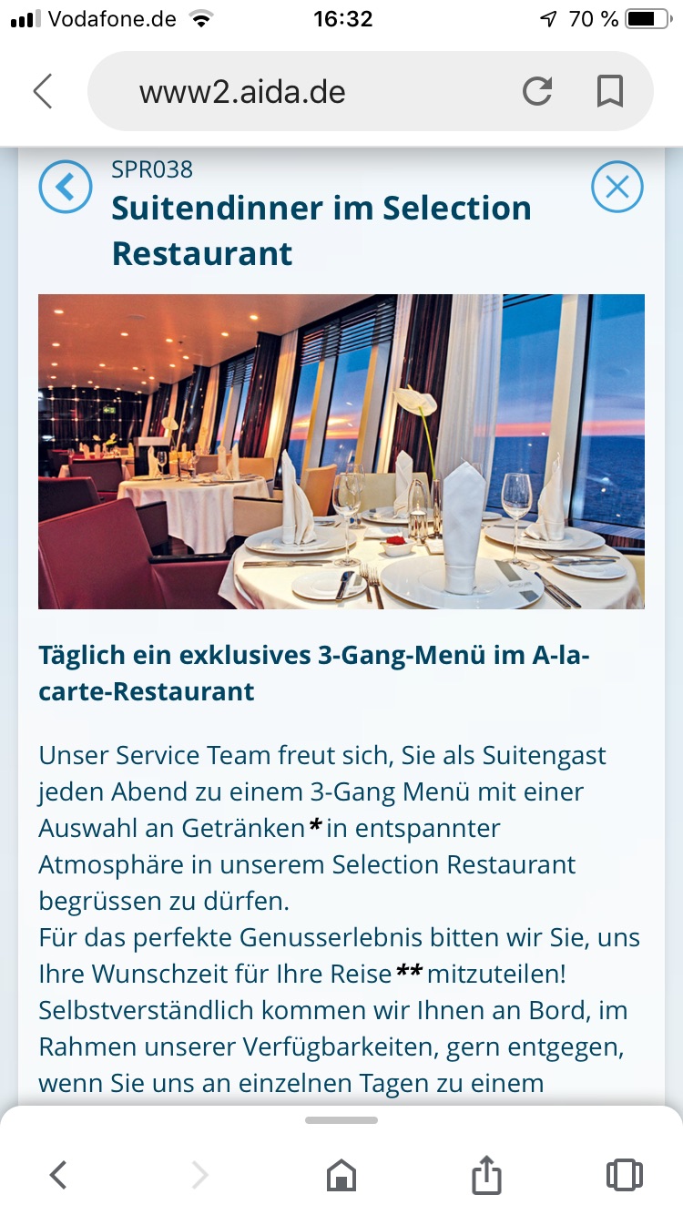 Fakt ist, dass ich mit meiner JS-Kabine für meine Kreuzfahrt mit der Aidamira vom 23.12.2019 bis 06.01.2020 das Selection Restaurant kostenfrei durchbuchen konnte.