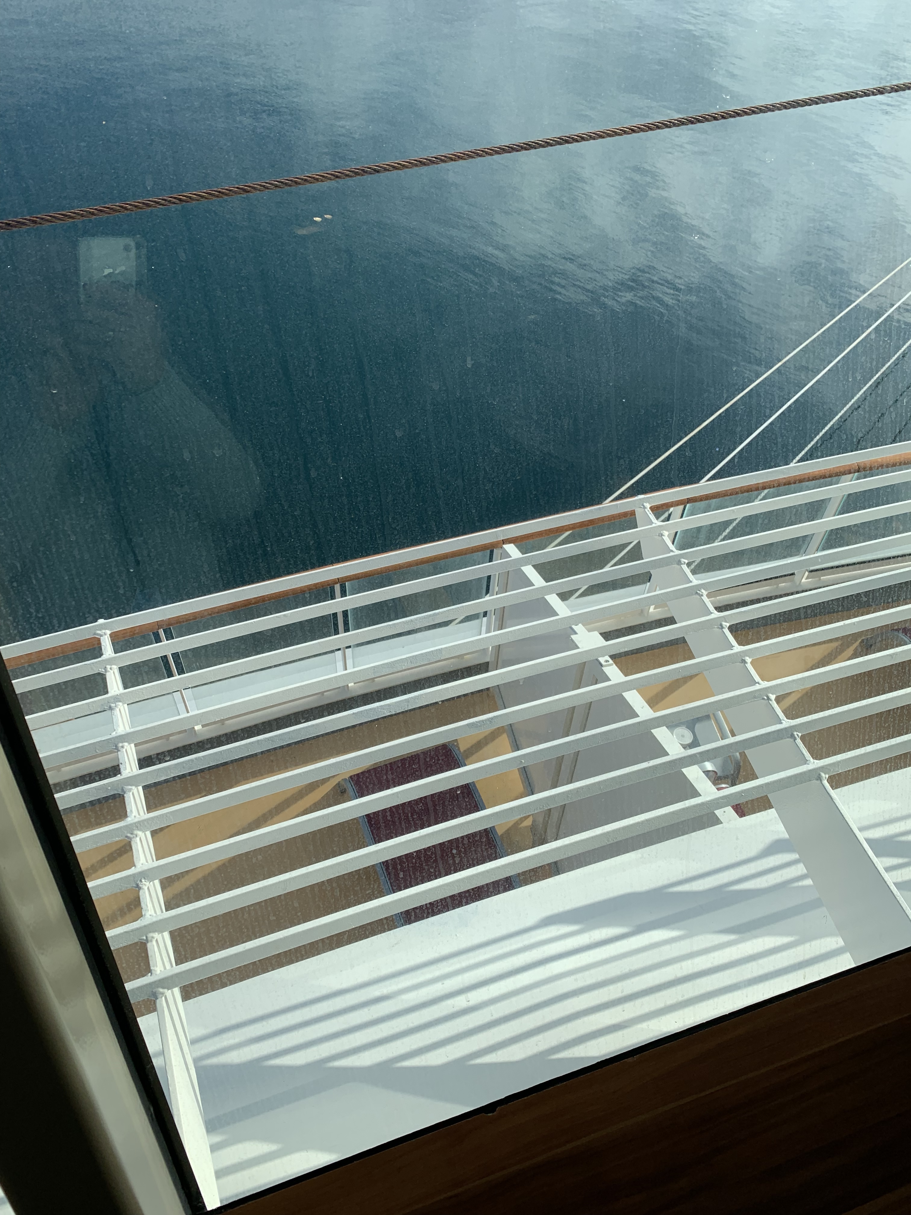 Auch kann man den Balkon von der Reling des Bella Donna auf Deck 10 recht deutlich einsehen. Vom Marktrestaurant ist er sichtbar, wenn man sich ans Fenster lehnt. Dort stehen unmittelbar aber keine Tische.