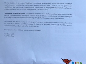 Mit 3 Postkarten können Sie das Fernweh Ihrer Mitreisenden wecken.Ich kann mich über die Zuverlässigkeit von AIDA Cruises in keiner Weise beschweren, alles was ich bisher angefordert habe, ist mir zeitnah zugestellt worden.