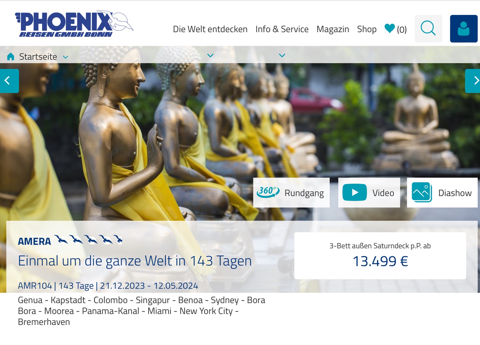 Die Alternativrouten der Amera werden von Phoenix zu sehr niedrigen Preisen angeboten. Bei der von mir gebuchten Reise AMR 108 ist der mir angebotene "attraktive" Rabatt deshalb auf ca. 9% geschmolzen.