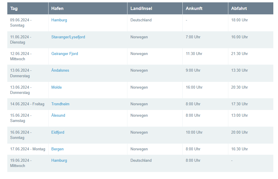 Husky bezieht sich auf den Routenverlauf (vor der Änderung im Dezember) der hier im Forum hinterlegt ist. Dort werden Molde und Hellesylt an einzelnen Tagen aufgeführt obwohl diese am gleichen Tag wie Andalsnes und Geiranger wären. Dadurch erscheinen im Routenverlauf 13 Tage obwohl es ja eigentlich nur 10 Tage sind: