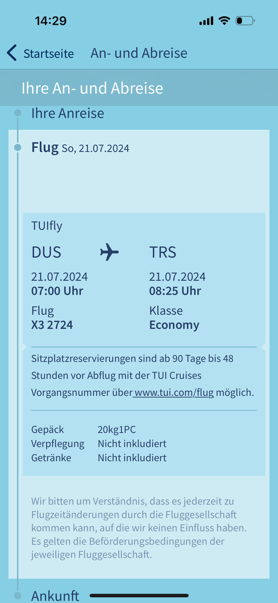 Hallo ich hab mal eine andere Frage ! Ich hab heute gesehen, dass die Flugzeiten für die Adria Reise im Sommer mit der MS6 raus sind! Vielleicht kann mir jemand helfen, ich scheine auf dem Schlauch zu stehen! Wieso ist der Hin- und auch der Rückflug mit nur 1h 25min angegeben? Laut Internet fliegt man 2:55h bis Triest und es liegt ja auch keine andere Zeitzone in Italien vor! Was übersehe ich? Oder hat tui einen Fehler bei den Angaben gemacht!