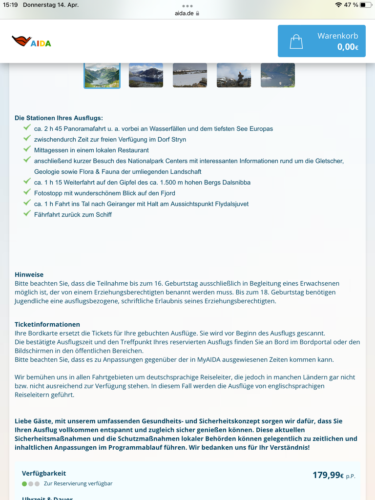 Ich finde sie sehr teuer , hatte jetzt im Internet gefunden das eine Fährfahrt hin und zurück auch 70€ pP kostet aber dann hab ich Aufenthalt in Geiranger — bei den Ausflügen werde ich nur umher gefahren und hab Aufenthalt an den Aussichtspunkten, die ich schon besucht habe! Natürlich ist das mein Problem , aber warum bietet aida nicht auch nur einen Transfer nach Geiranger an.