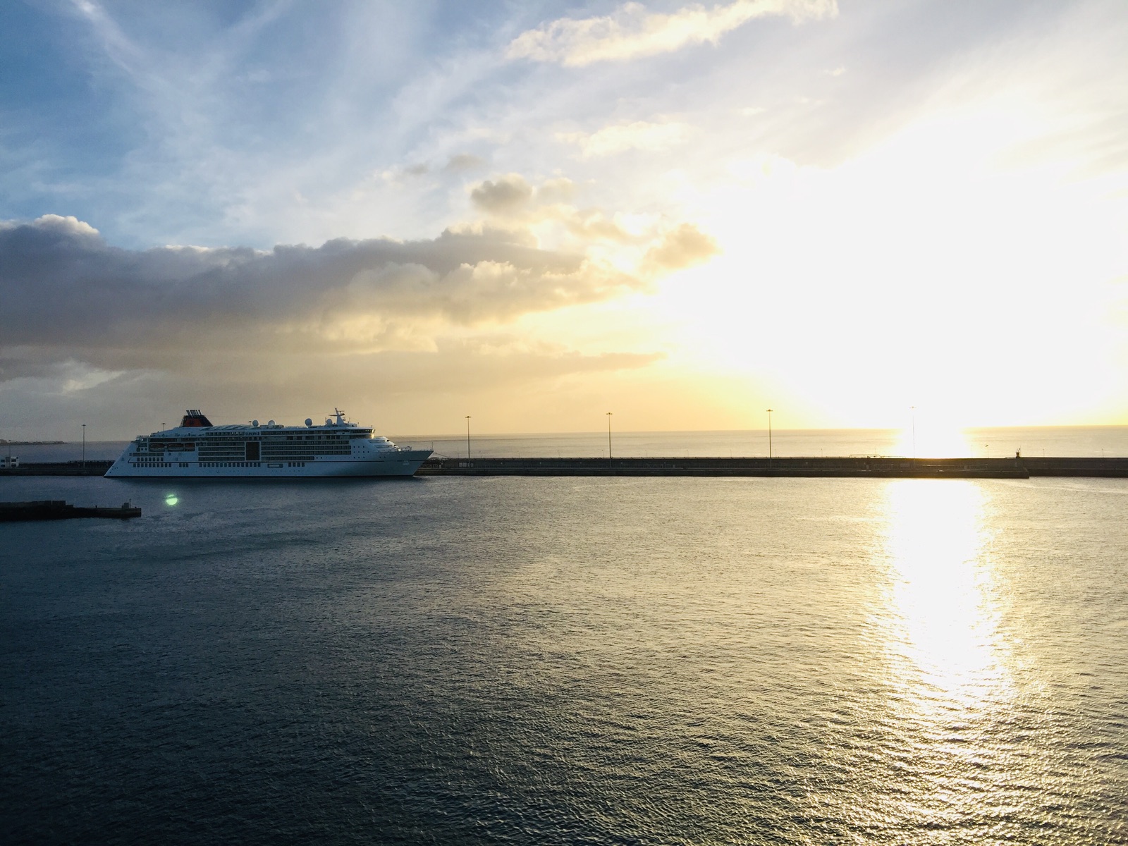 Guten Morgen, viele Grüße von der Mein Schiff 1, wir laufen gerade in den Hafen ein, auf Fuerteventura (Puerto del Rosario). Ist noch dunkel.