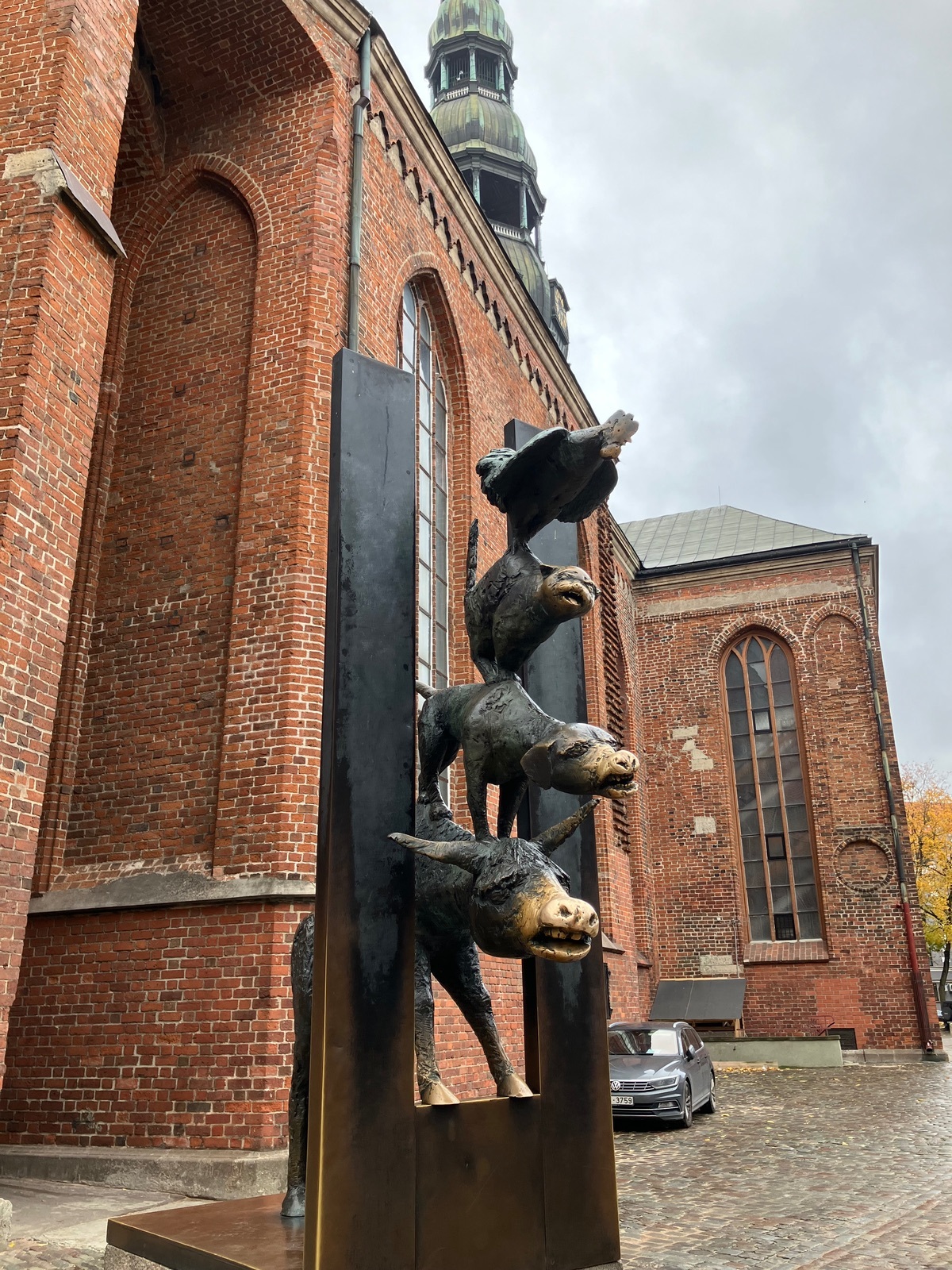 Auf der Rückseite der Kirche stehen diese Gestalten:Die sind tatsächlich ein Geschenk der Stadt Bremen. Eigentlich war in Riga ein Park mit Skulpturen der Partnerstädte geplant, dazu ist es aber nicht gekommen, und deswegen steht diese jetzt in der Altstadt. Die Original Bremer Stadtmusikanten sehen aber wesentlich un-gruseliger aus, finde ich. 😂🙈