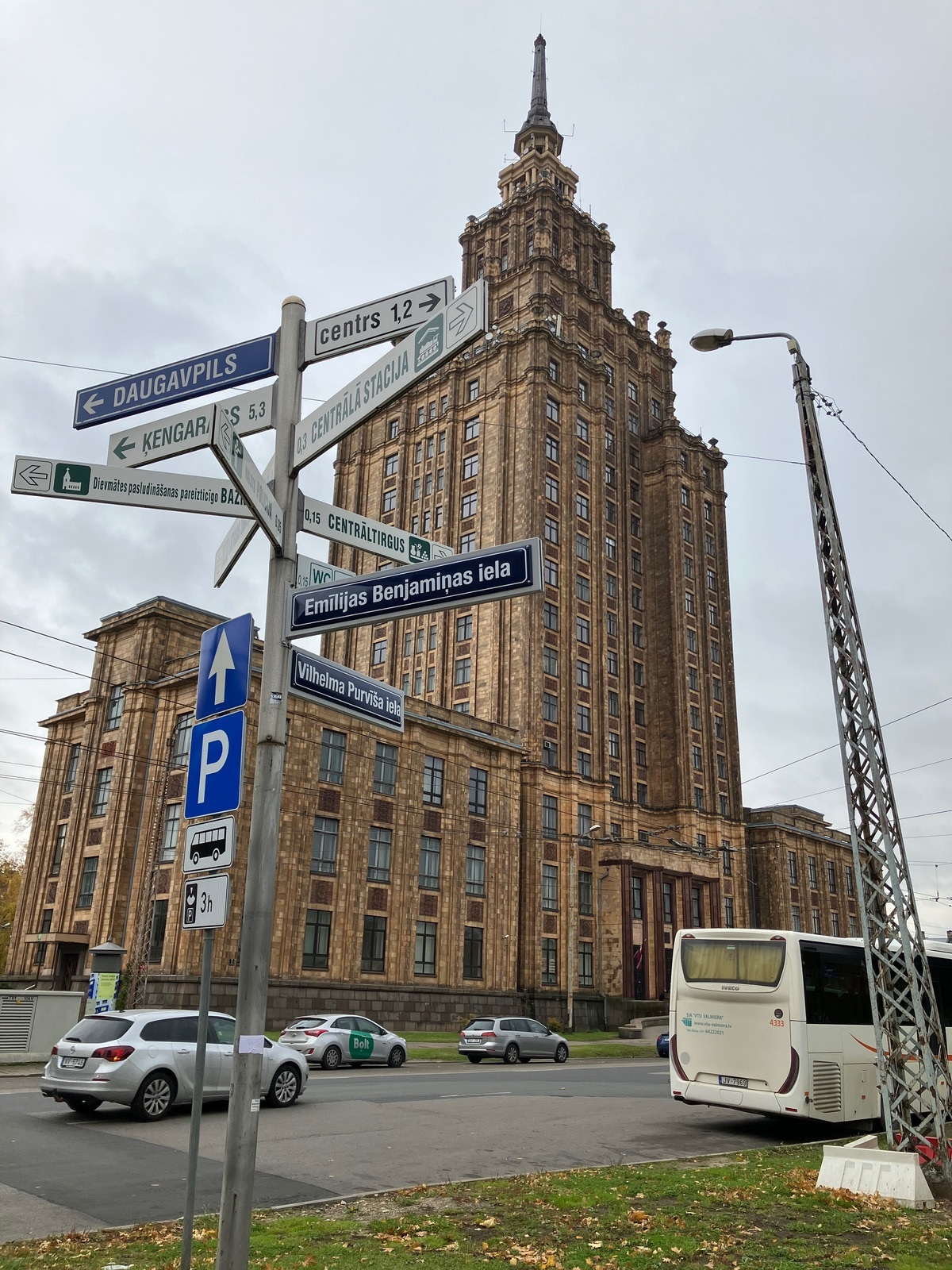 Als ich einmal über den Markt gelaufen war, stand ich auf einmal vor einem Wegweiser: „Academy of Science“. 😀 Dann kann ich mir ja doch nochmal Riga von oben anschauen, also nichts wie hin. War dann sehr leicht zu finden, und als ich da war, habe ich nochmal bei Google Maps geguckt, wie das denn da heißt. Also wenn ihr auch mal in Riga seid und da hin wollt, müsst ihr „Riga Panorama“ eingeben (oder die Straßennamen auf dem Foto).