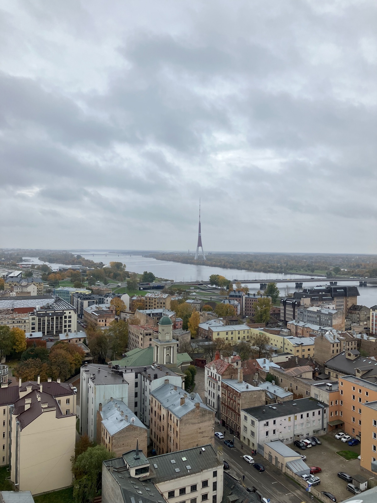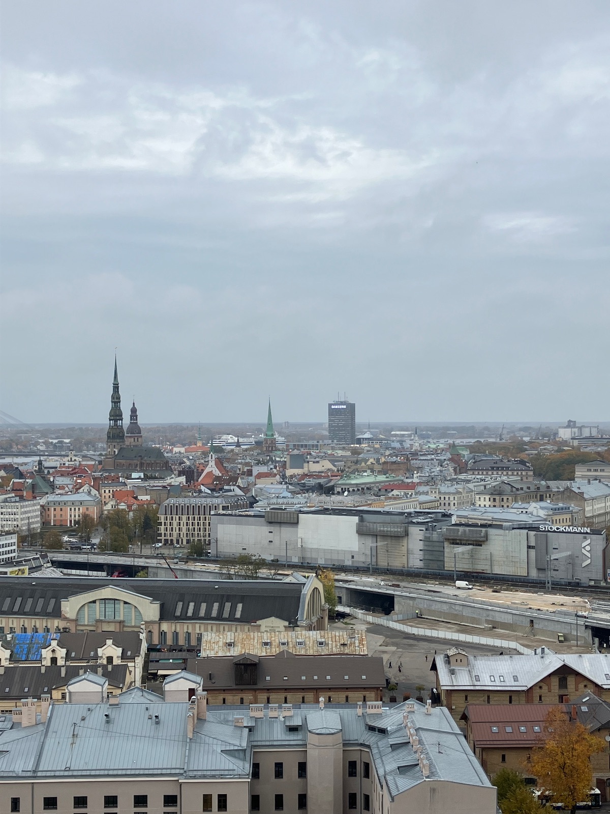 Da standen 6 Busse, aber keine Ahnung, wo die Leute alle waren, ich war jedenfalls fast alleine da drin. Es gibt unten im Foyer einen Ticket-Automaten, Eintritt für die Aussichtsplattform 8€. Man kann aber auch an einem Schalter mit Bargeld bezahlen. In den 15. Stock kann man mit dem Fahrstuhl fahren, und die Plattform ist in der 17. oder 18. Etage, hab ich nicht ganz gerafft, weil die Treppen so verwinkelt waren. Auf jeden Fall lohnt sich der Ausblick auf die Stadt, die vielen Brücken, den Fernsehturm und den Fluss Daugava.