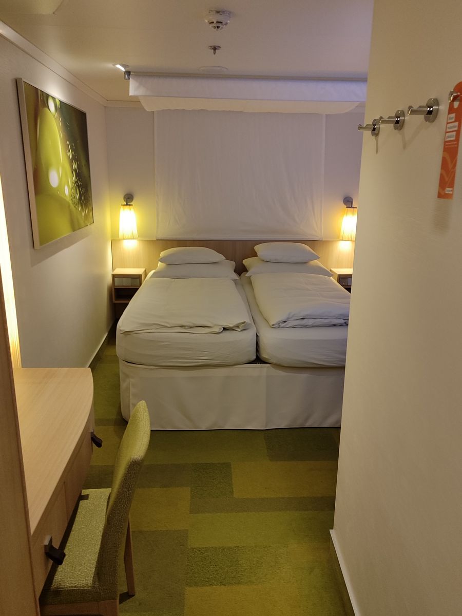 Die Kabine hat einen grünen Teppichboden und ansonsten alles Gewohnte auf kompaktem Raum. Alleine habe ich mich natürlich nicht beengt gefühlt. Das Raumklima ist naturgemäß nicht so frisch wie in einer Balkonkabine, war aber ok. Die Klimaanlage konnte gut eingestellt werden.