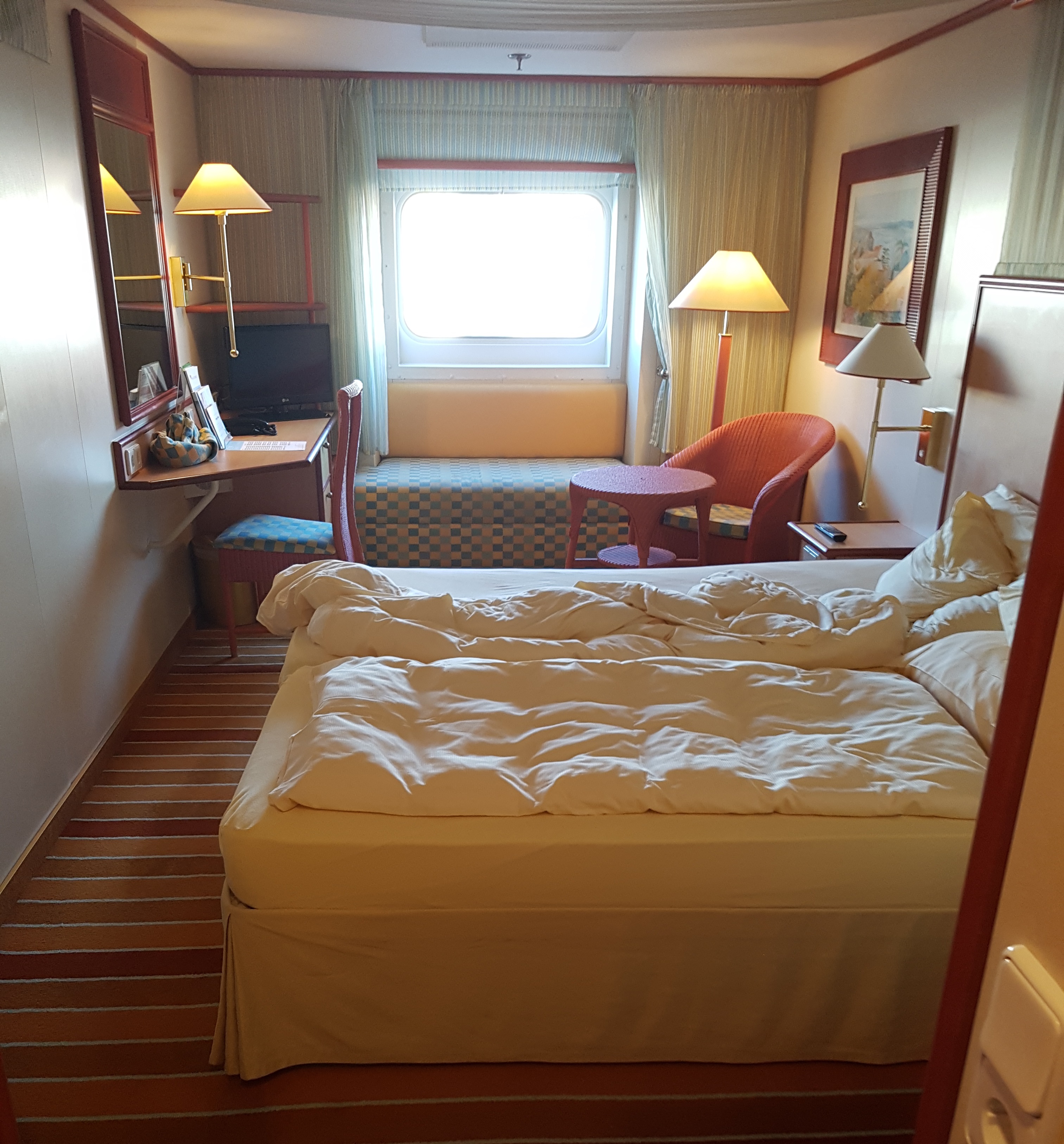 Wir hatten die Kabine auf der Route "Hamburg nach Gran Canaria" im Oktober/November 2017. Sie ist nicht arg groß, das muss man sagen. Uns hat es aber ausgereicht. Man kann aus dem Fenster zwischen 2 Rettungsbooten durchsehen. Natürlich kann man nicht wie bei anderen Aussenkabinen so gut nach rechts und links sehen, aber uns reicht es auch mal aus, um einfach mal raussehen zu können. Der Preis war recht günstig dafür.