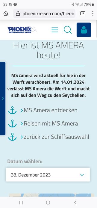 Schon klar - aber das Schiff fährt dann nur noch 3 Wochen für Phoenix. Darum ist für mich die Berichterstattung aus der Sicht von Phoenix unverständlich. Herr Morr bezahlt ja nicht seine Reisen, sondern wird eingeladen.