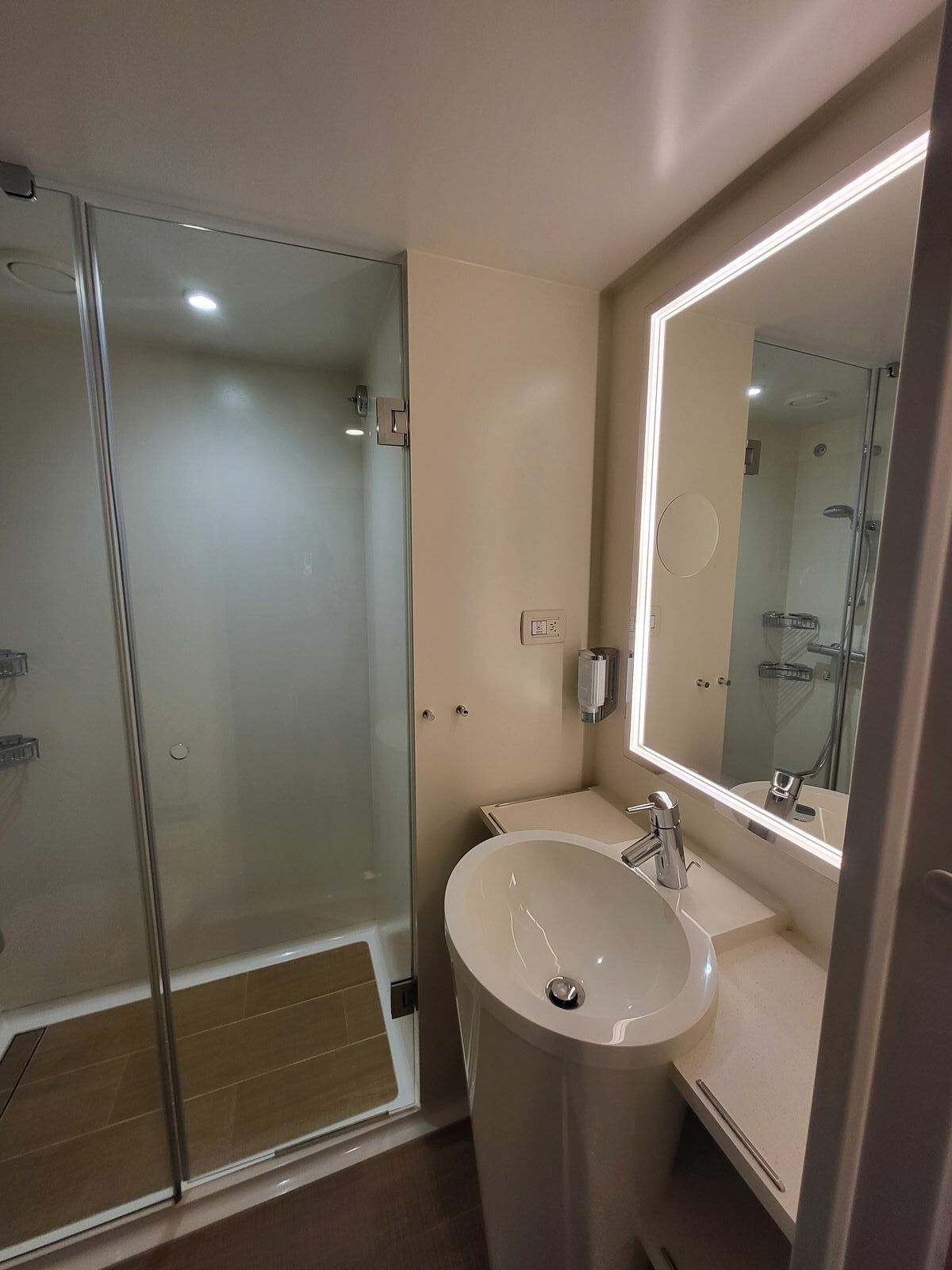 Ruhige Meerblickkabine relativ weit vorne und nahe am Treppenhaus. Wir haben die Kabine zu dritt bewohnt und hatten ausreichend Platz. Den begehbaren Kleiderschrank hätte ich persönlich nicht gebraucht, hätte dafür lieber etwas mehr Platz gehabt. Aber das ist mein subjektives Empfinden. Die Kabine wurde uns im Vario zugeteilt, würde sie aber jederzeit auch Premium buchen.