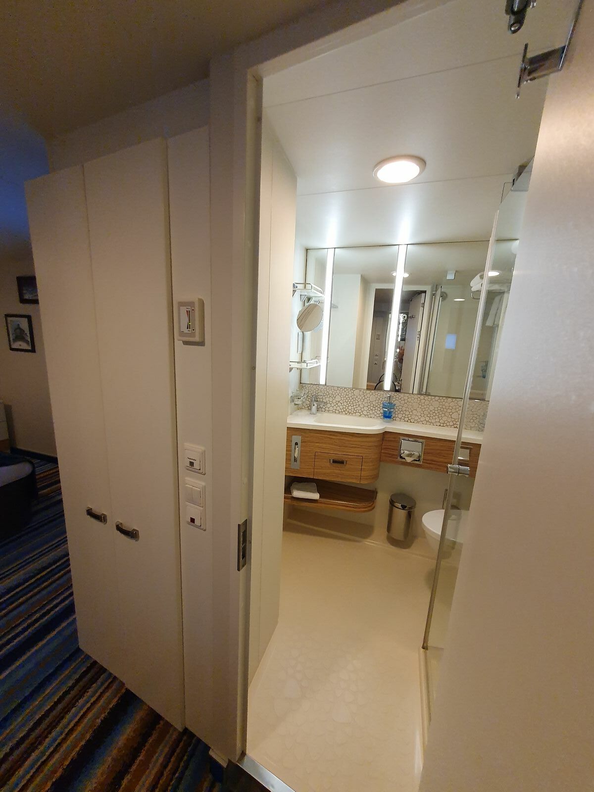 Wir buchen Innenkabine, da wir nur bei völliger Dunkelheit gut schlafen. Leider ist die Kabine nicht dunkel zu bekommen. Eine Lichtquelle im Bad bleibt immer an. Das Licht fällt dann durch die Türschlitze oben und unten in die Kabine. Das Betätigen des Hauptschalters hilft auch nicht wirklich, da das Lämpchen im Schalter dann hübsch grell hellgrün leuchtet.