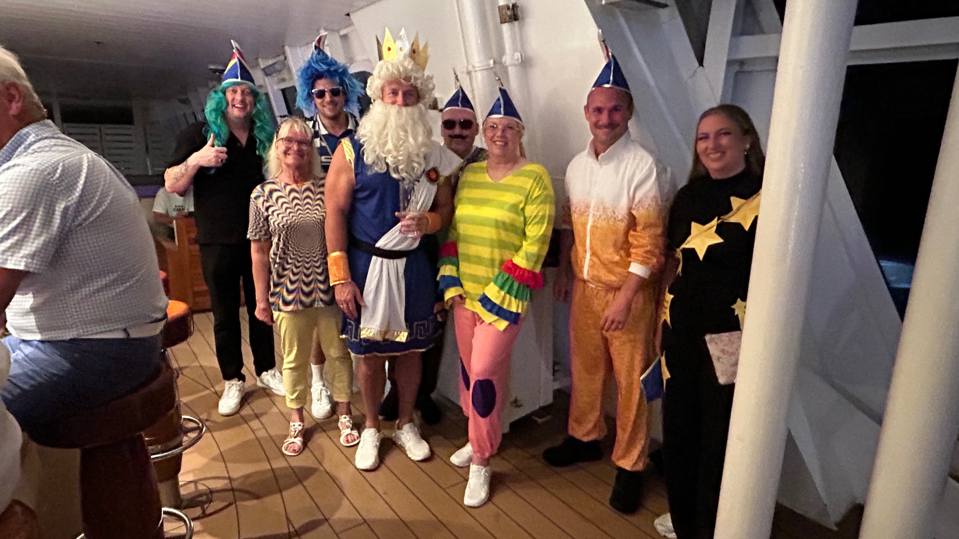 Am Abend wurde es offiziell unter der Narrenkappe. Die Offiziere tauschten ihre Autorität gegen puren Übermut. Sogar der Kapitän ließ sich als Zeus breitschlagen und bildete mit seiner Crew einen Elferrat, der vermutlich jeden Eisberg einfach weggelacht hätte.
