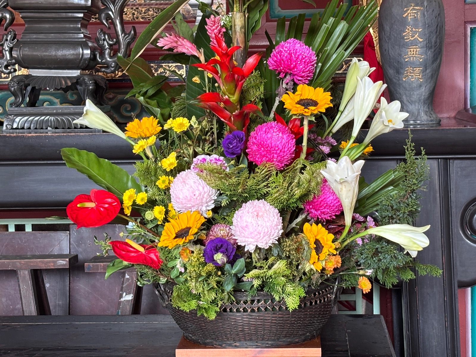 Die Blumen haben ihre Bedeutung. Zb die Orchidee steht für Bescheidenheit und für Gelassenheit und Reinheit steht die Chrysantheme.