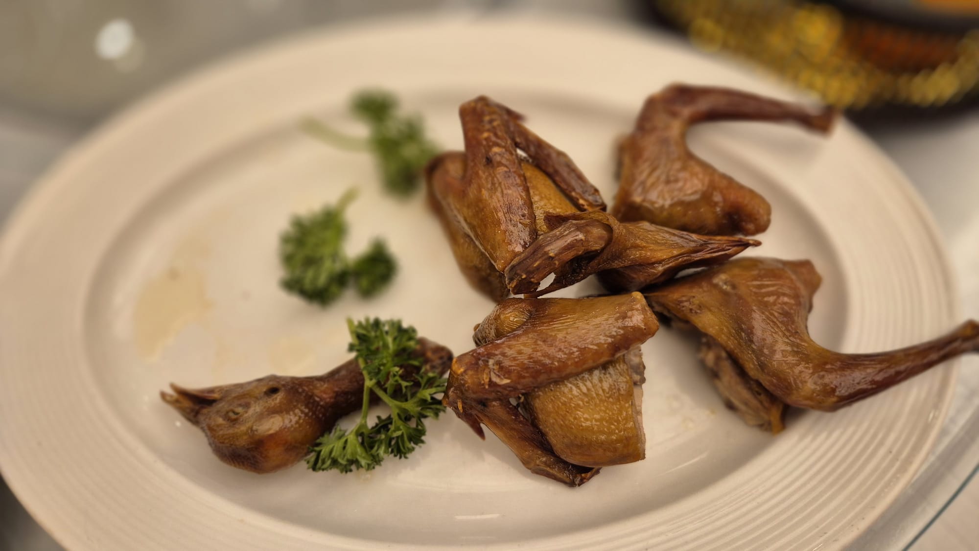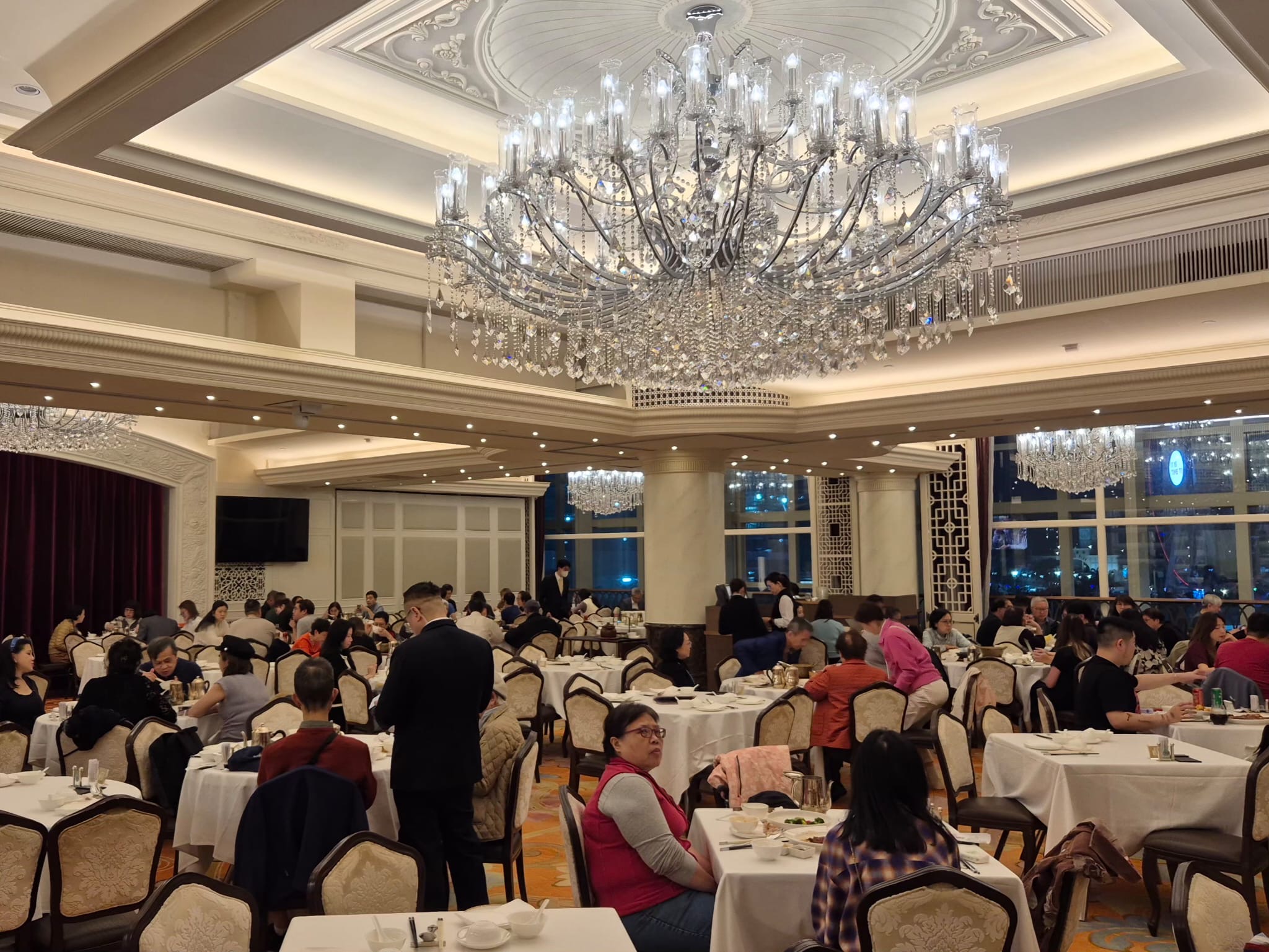 Wir speisten in einem Restaurant, das so groß wie ein Ballsaal war. Unter Kronleuchtern, die vermutlich schwerer waren als unser gesamtes Reisegepäck, gab es: