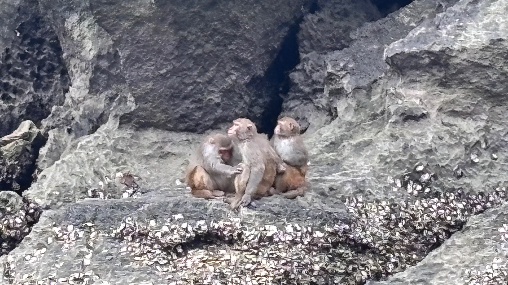 Überraschung – eine Gruppe neugieriger Makaken, die dort ihr Revier haben.
