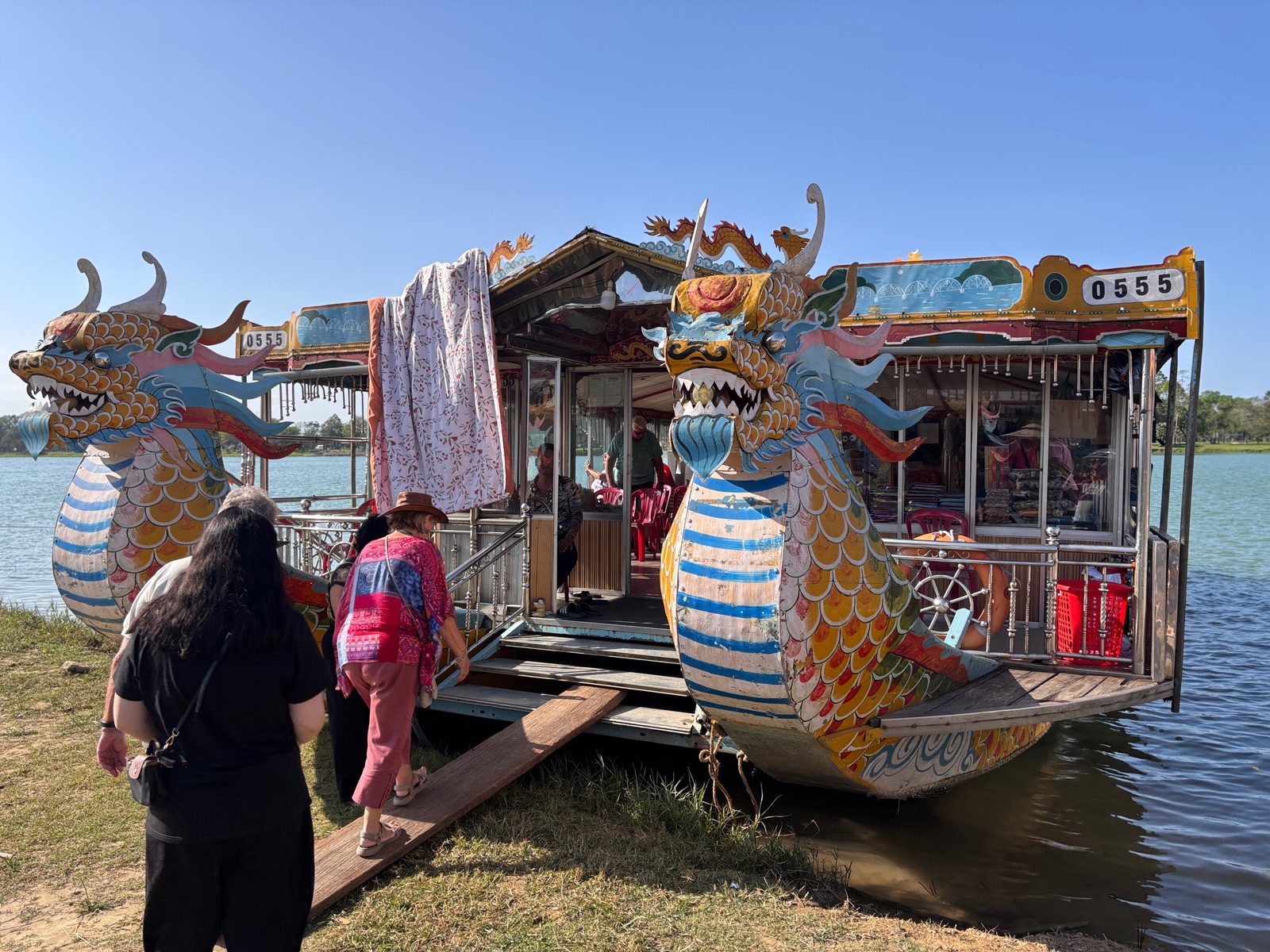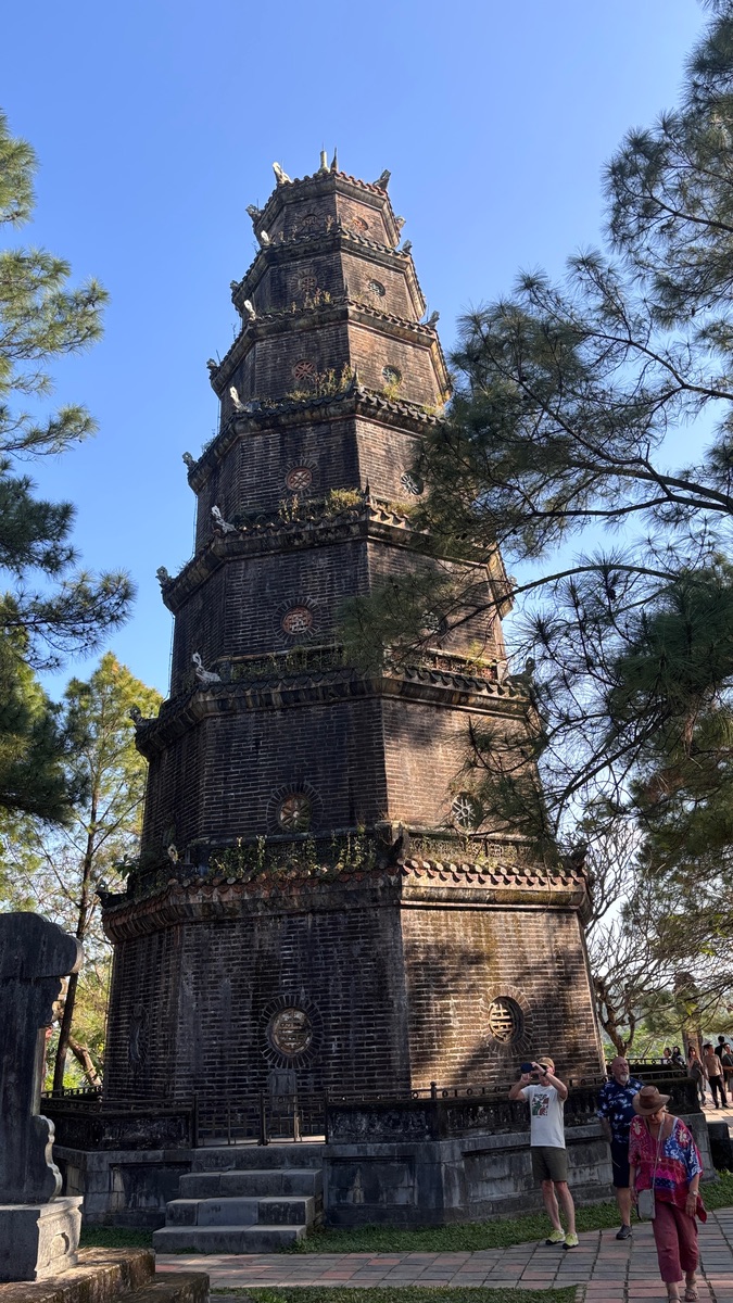 Frisch gestärkt ging es aufs ein Drachenboot. Wir hatten uns auf eine mystische Reise eingestellt, landeten aber in einem schwimmenden Souvenirshop. Wer braucht schon kaiserliche Stille, wenn man auch T-Shirts und Kühlschrankmagneten kaufen kann? Aber Hand aufs Herz: Bei der Hitze war der Fahrtwind auf dem Parfüm-Fluss genau das, was wir nach dem Knoblauch-Exzess brauchten. Die Thien Mu Pagode (UNESCO-Weltkulturerbe!) war dann der perfekte kulturelle