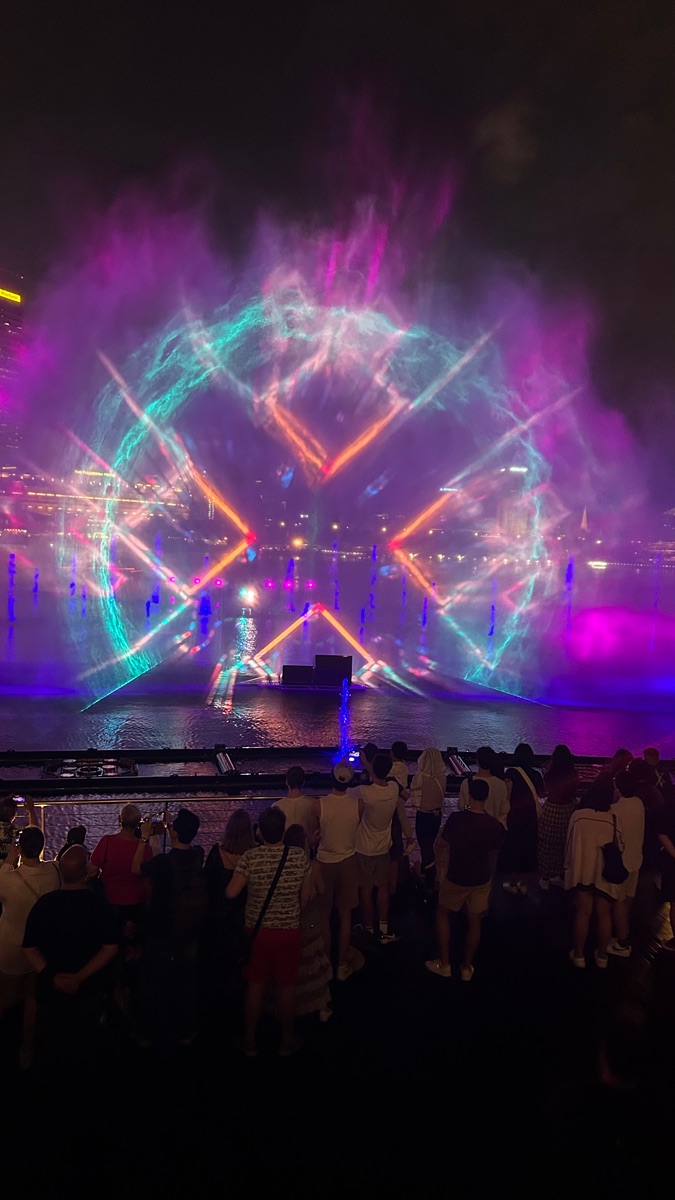 Getrieben von den Menschenmassen weiter zu den Lichtspielen vor dem Marina Bay sends Hotel. Laser Show