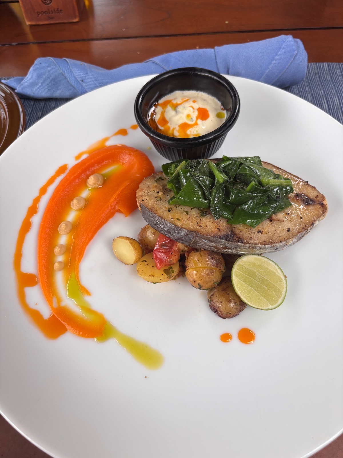 Ein schönes Stück Fisch fast ohne Gräten an einem Karotten Schaum sowie eine Buttersoße