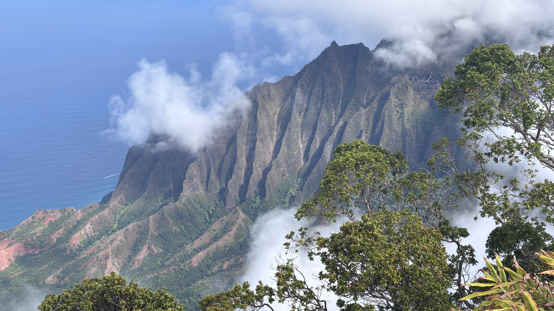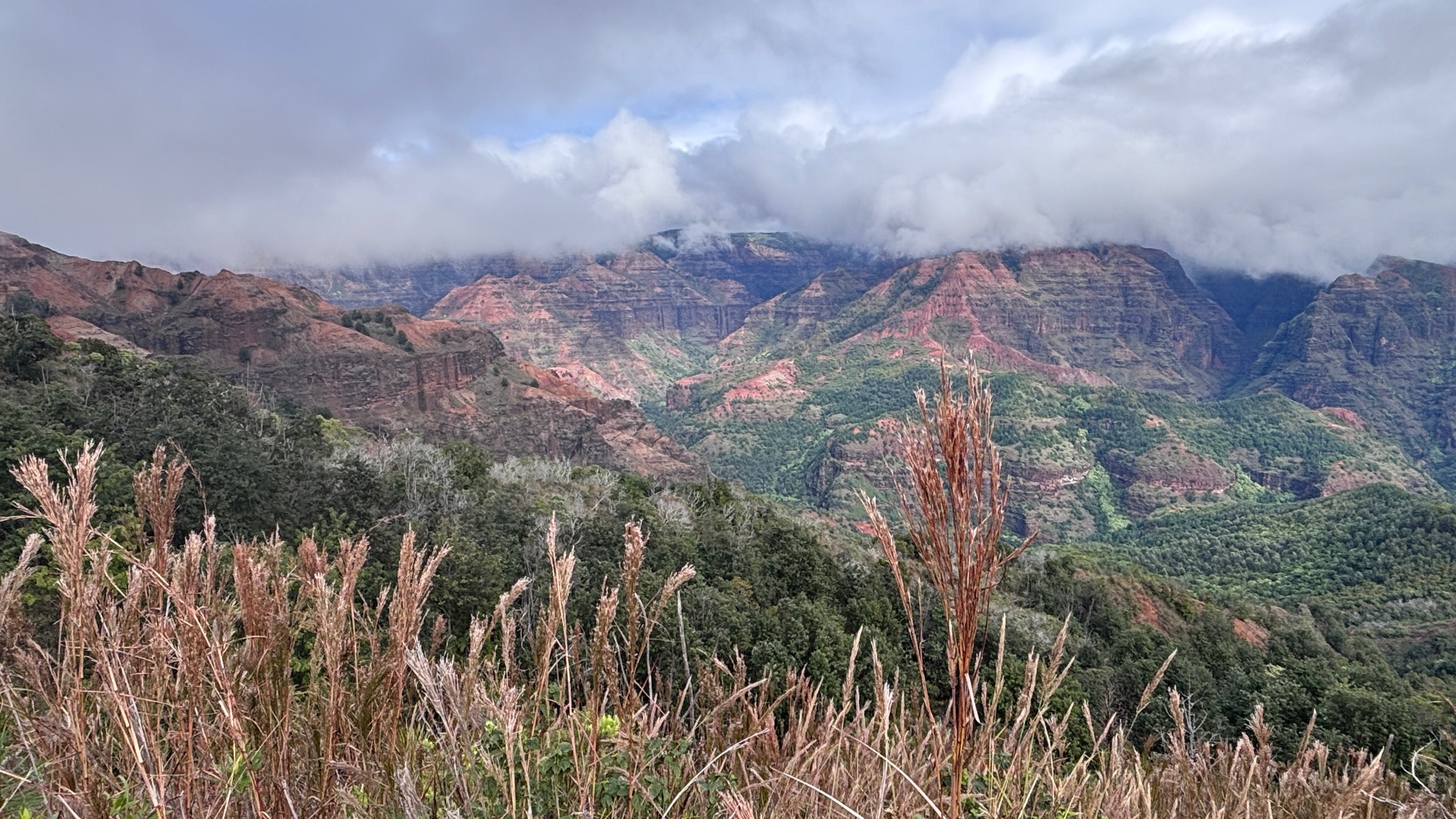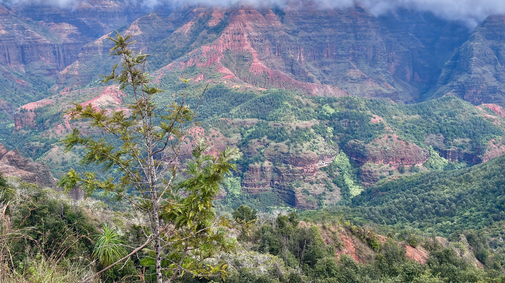 und den gewaltigen Waimea Canyon – zu sehen, genau in der kurzen Lücke, bevor der Nebel die Sicht verschluckte.