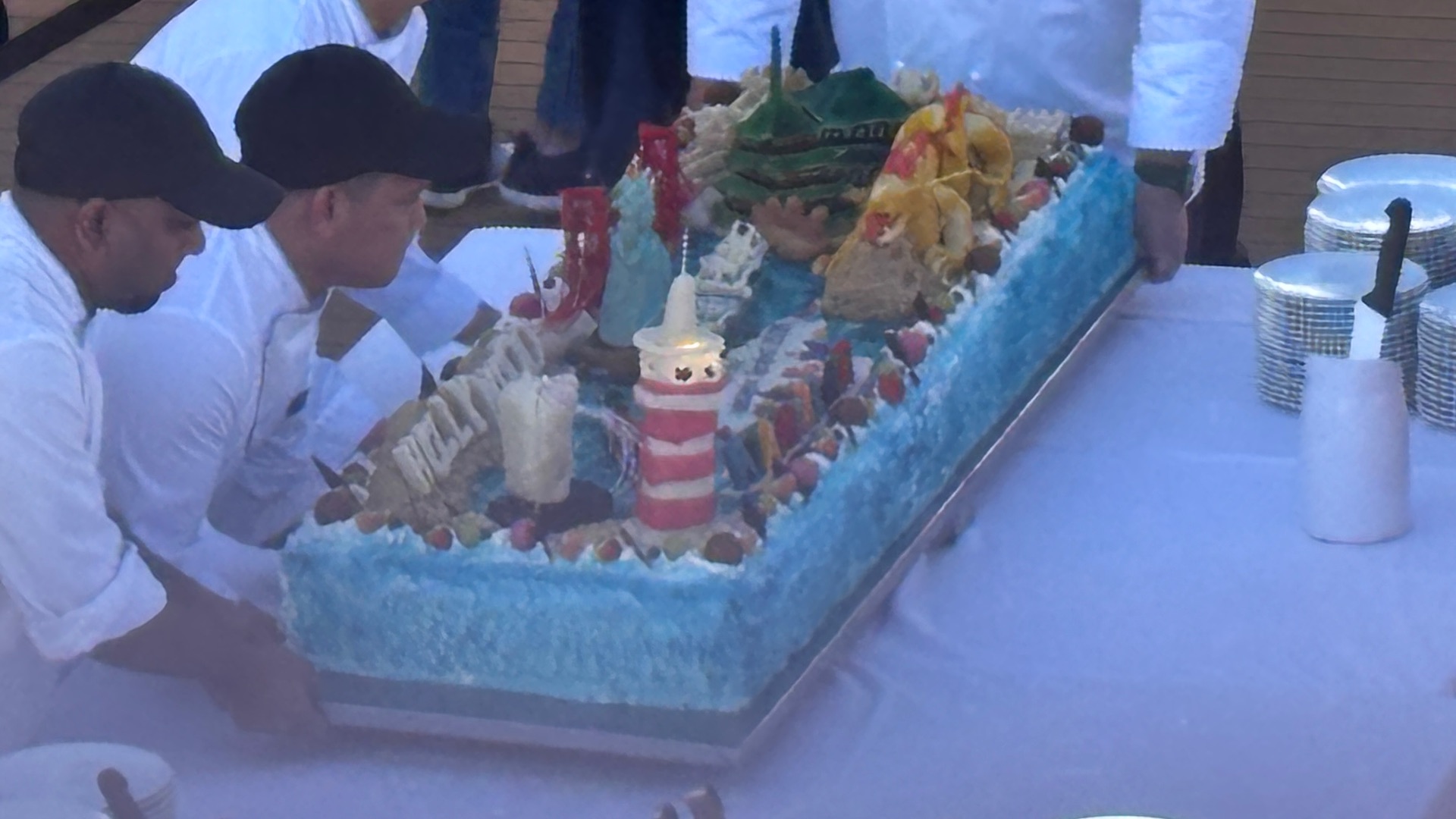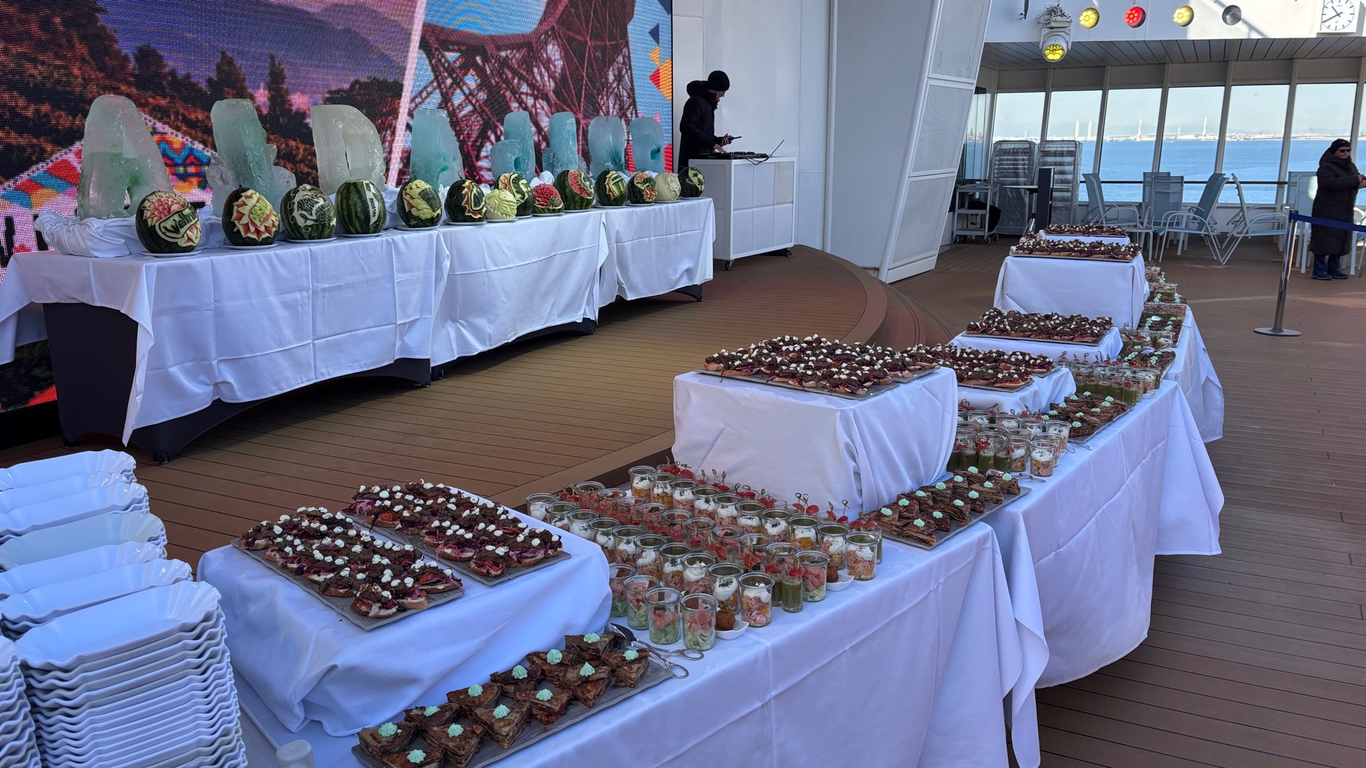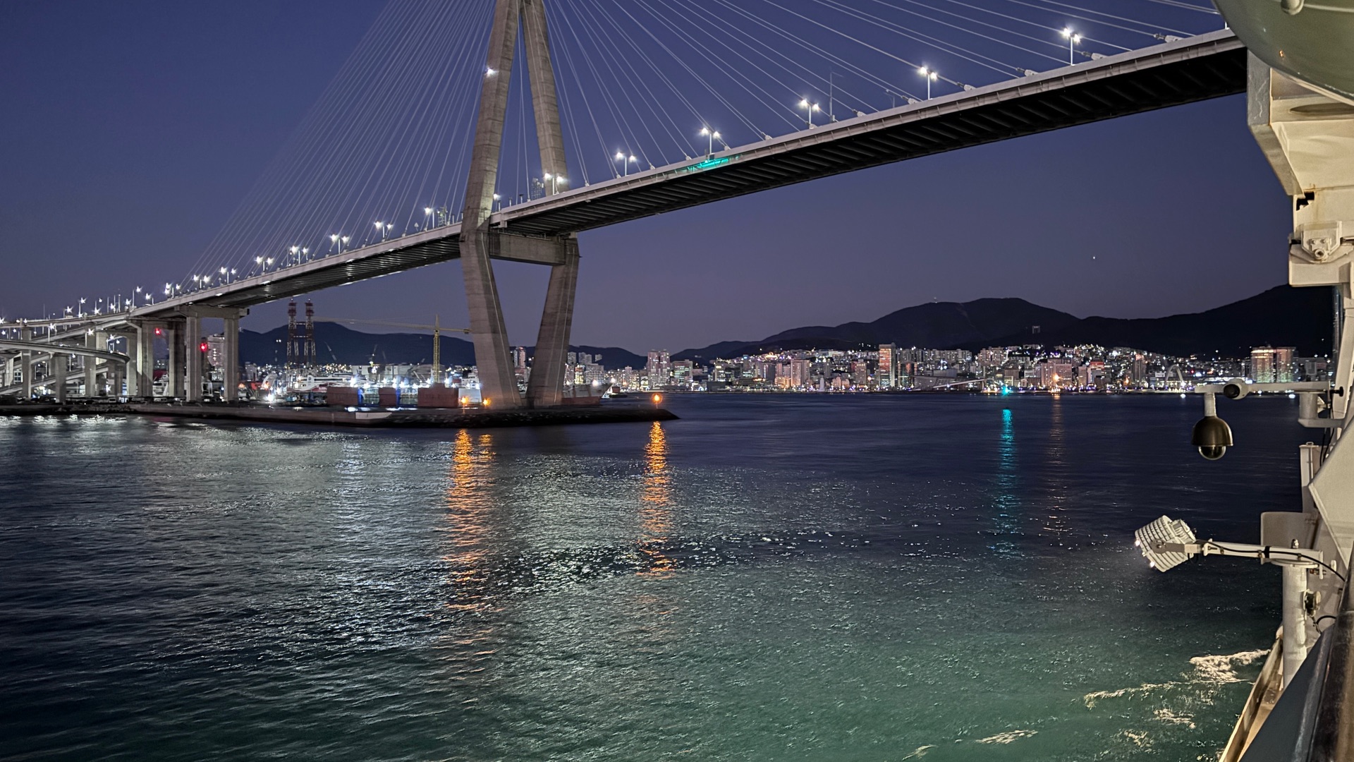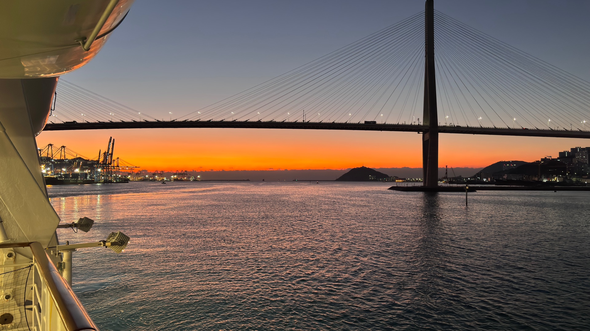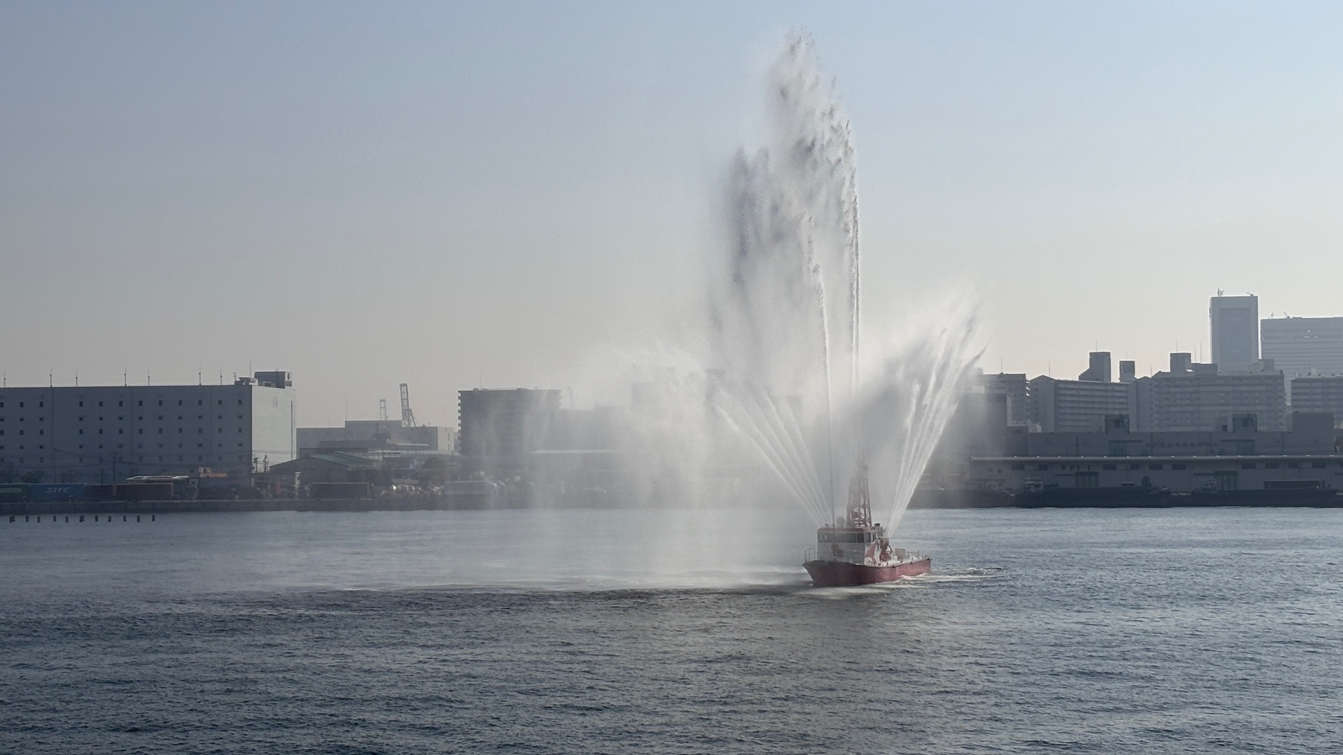 Grandioser Empfang in Kobe durch ein Feuerlösch Boot das seinen Wasserstrahl abwechselnd in den Aida Farben leuchten ließ.