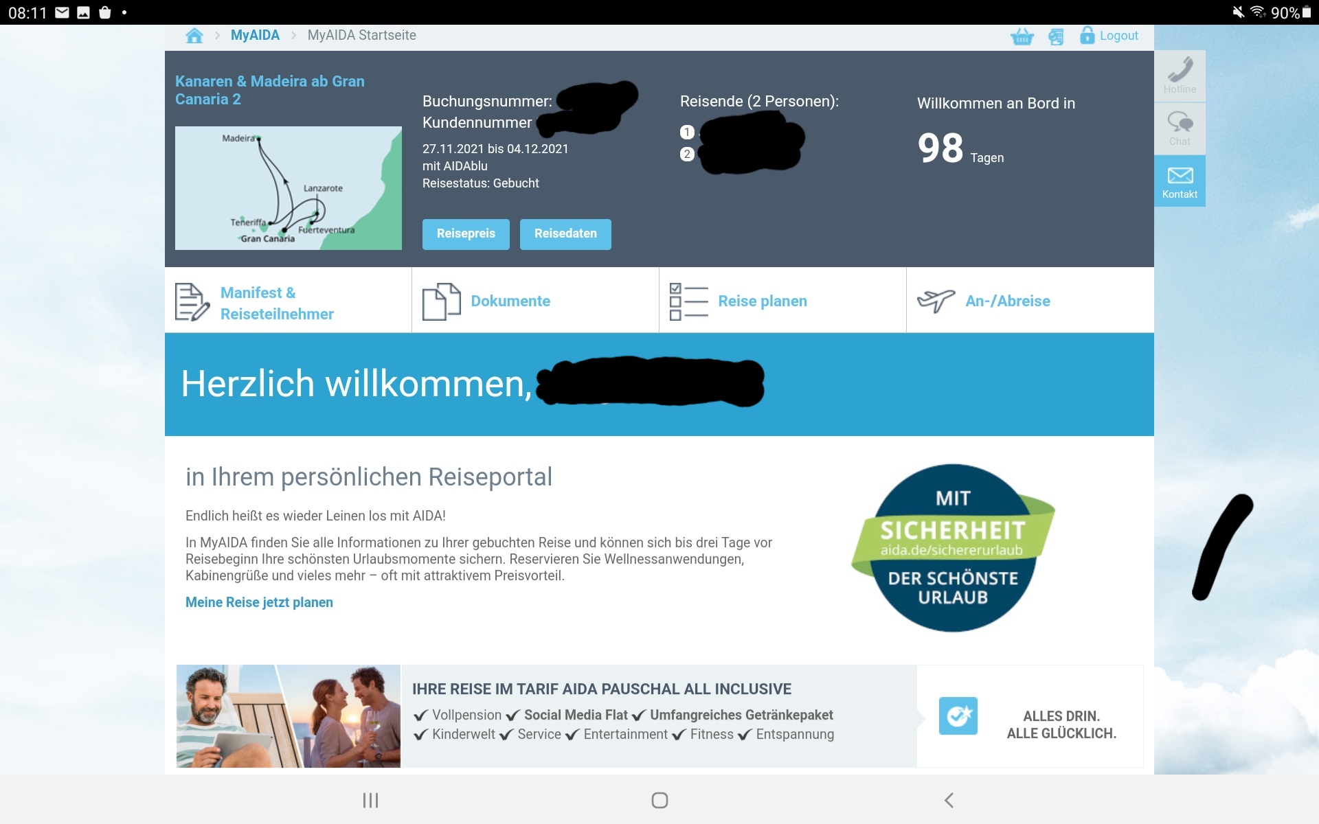 Die All inklusiv Leistungen standen nur im Buchungsportal und in meinem MyAIDA-Bereich. Hier war zutreffenderweise die Rede von 'Ihre AIDA Reise im Tarif Pauschal All inklusive':