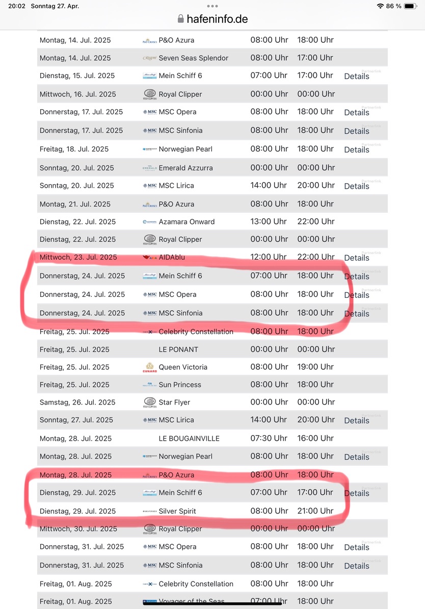 Hallo! Ich möchte eine kleine Anmerkung zu Kotor vornehmen: Kotor wird zweimal angelaufen. Beim ersten Anlauf am 24. Juli sind noch zwei weitere Schiffe von MSC vor Ort. Beim zweiten Anlauf lediglich die Silver Spirit. Vielleicht ist es sinnvoll, Kotor auf eigene Faust zu erkunden, wenn nur die Silver Spirit da ist. Beim großen Andrang von drei Schiffen ist es eventuell günstiger, einen Ausflug über die Reederei zu buchen. Die Route des Hop on Hop off- Busses ist auch interessant. VG