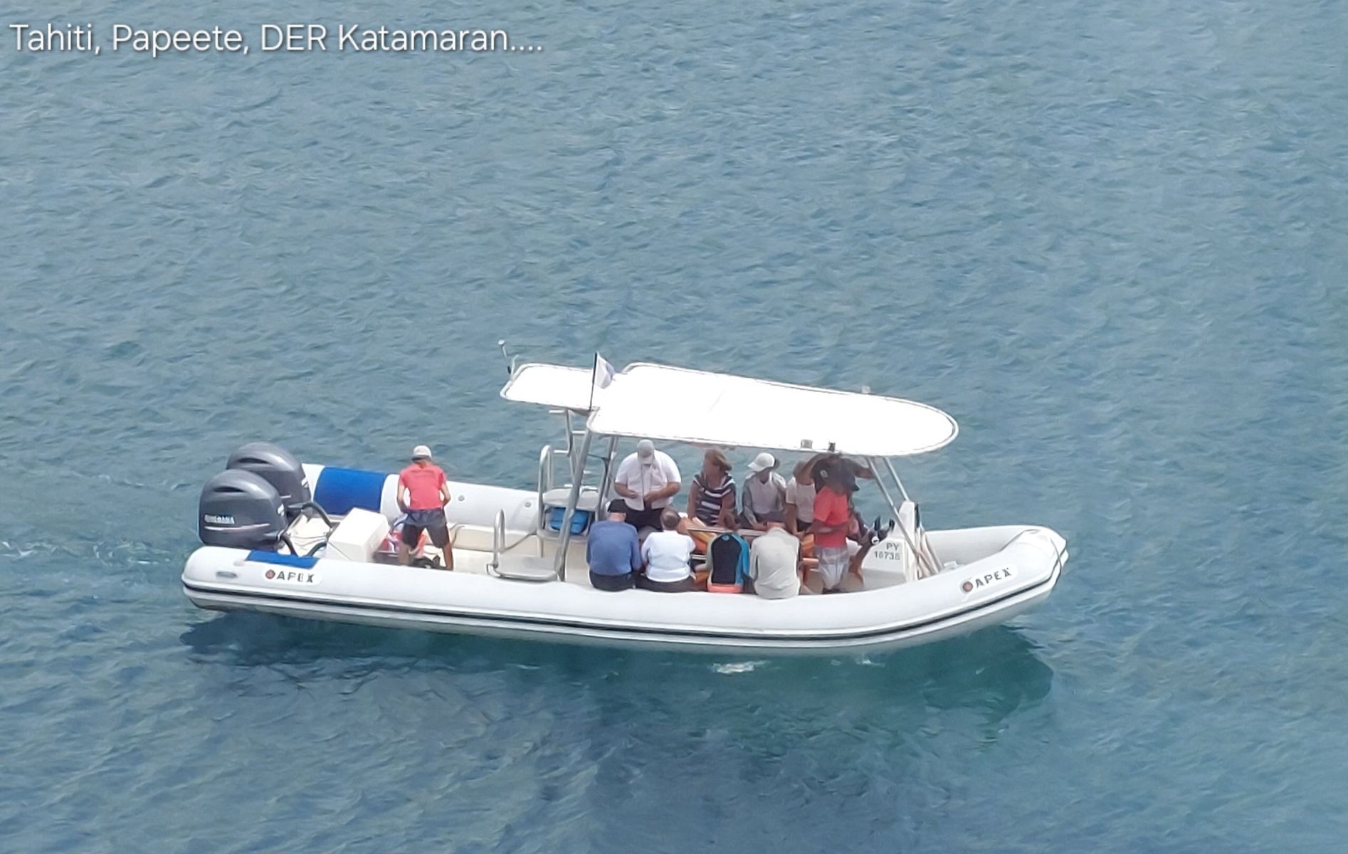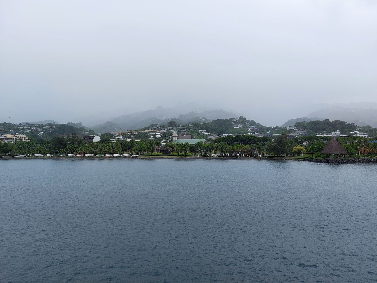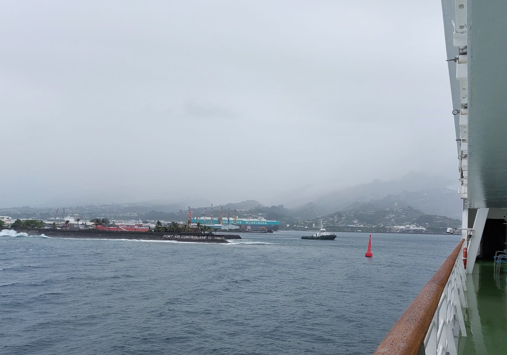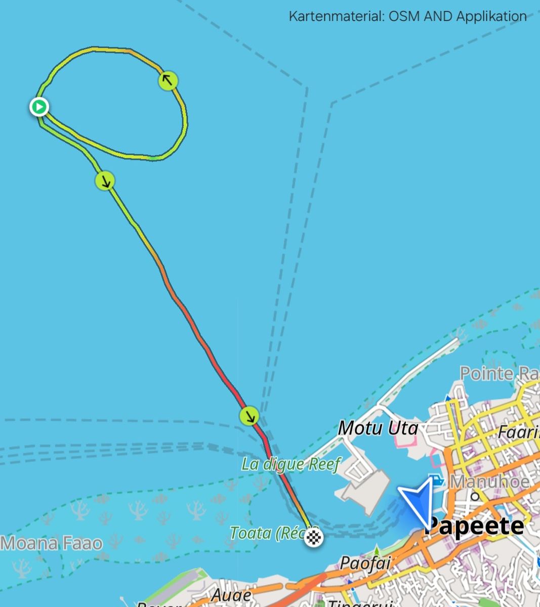 Wir mussten die geplante Einfahrt in den Hafen von Papeete regelrecht abbrechen, da eine Regenfront mit Wind aufzog und keine sichere Einfahrt durch die sehr schmale Hafeneinfahrt zuließ. So haben wir wie in der Fliegerei Position gehalten und eine Platzrunde gedreht.