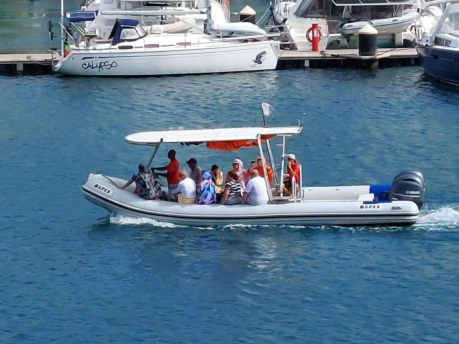 Draußen am Pier stand bereits ein AIDA Guide/Offizier zum Check-in, aber kein Katamaran weit und breit - nur zwei bessere Dingis mit Sonnendächle.