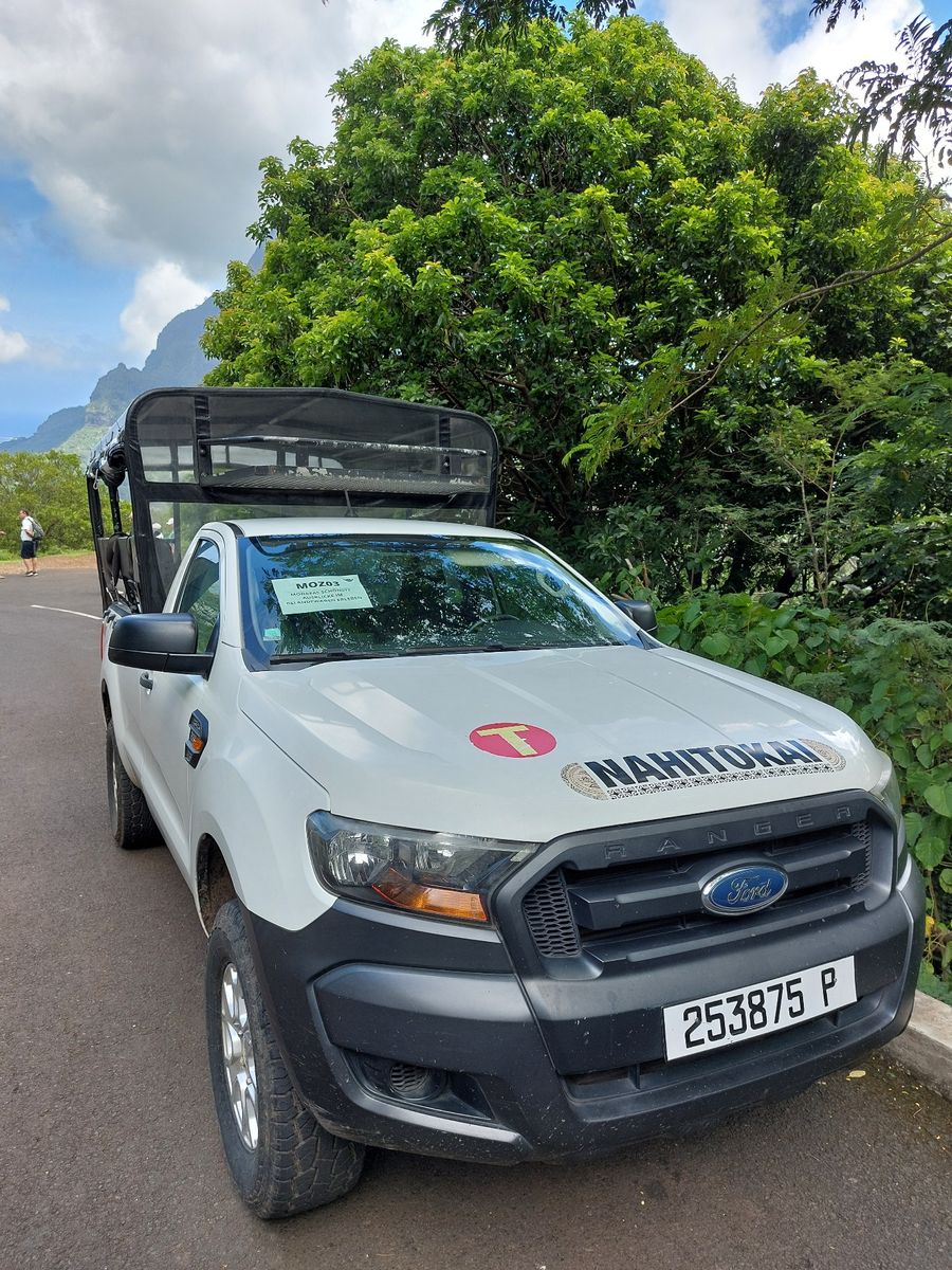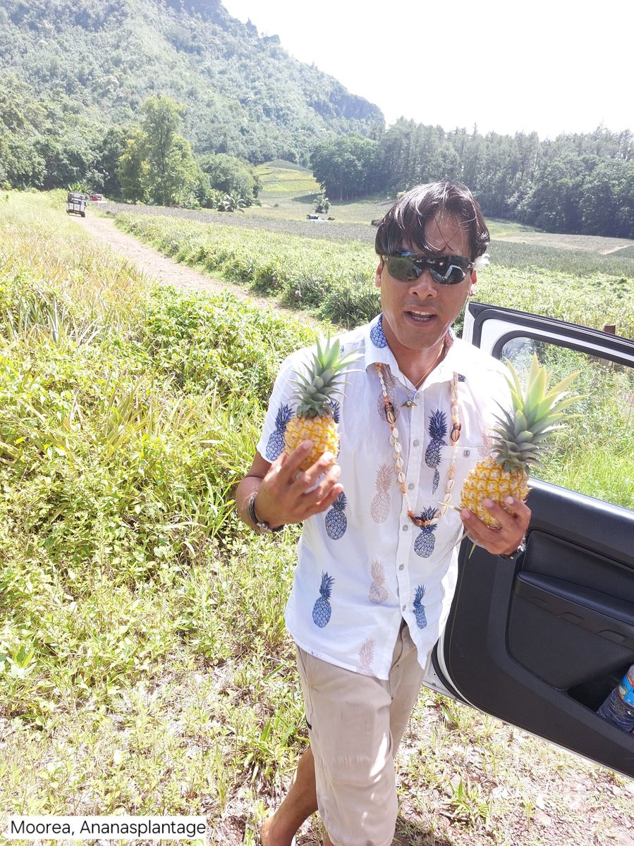 Die Tour führte uns über den Tropical Garden (Vanille-Anbau) mit schönen Blick zum Hausboot, einer Furt mit angefütterten heiligen Aalen mit blauen Augen, einer Ananas-Plantage (bei welcher unser Fahrer frische Ananas zur Verkostung aufgeschnitten hat - 😋³), fast zur Inselmitte - Belvedere de Opunohu mit Blick auf die Opunohu Bay (in welcher die schöne Lady AIDAsol lag) und Cook Bay (in welcher die PaulnGauguin und der 4-Master Wind Spirit lagen), getrennt durch den Mount Rotui. Anschließend gings noch zum Giften und einem Stopp an einem öffentlichen Beach, bevor es zu Schiff zurück ging.