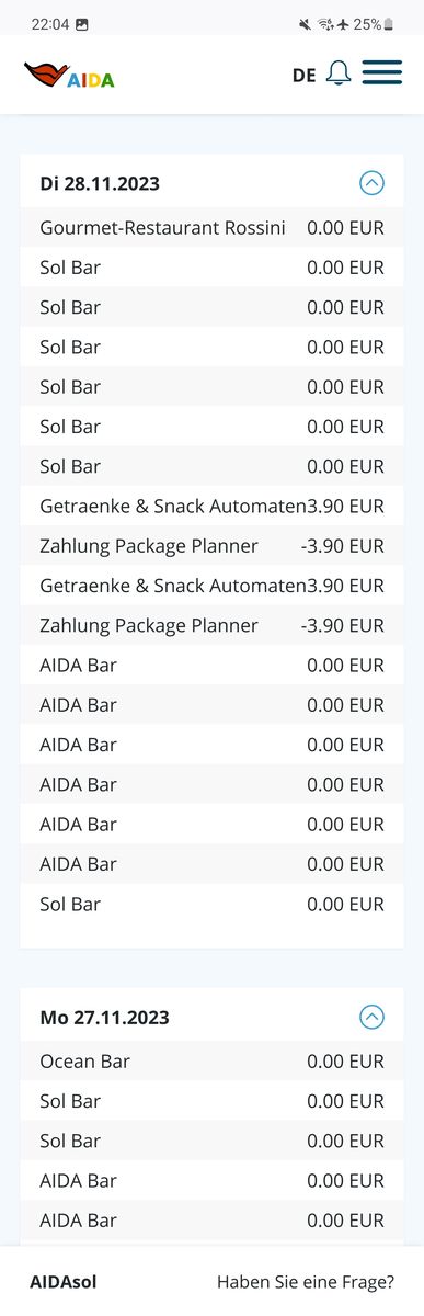 wir haben 2023 auf der Mar und 2023/24 auf der Sol die AGB an Bord vorlegen lassen und dann auch diese Kaffee-Hick-Getränke als inkludiert (abgerechnet) bekommen.